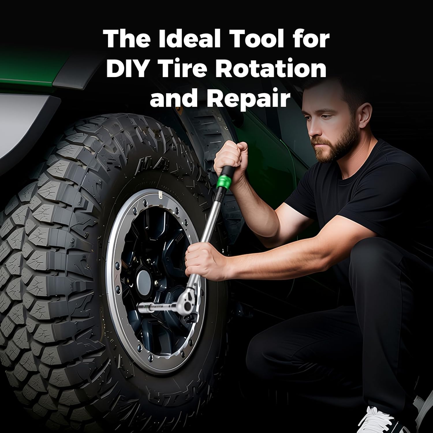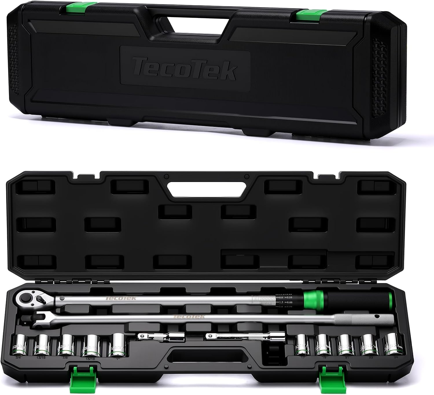 TecoTek 14pcs torque wrench set includes 1/2 Inch click torque wrench - 24", breaker bar - 24", 3 & 5-Inch extension and 10x deep sockets, which is the all-in-one solution specifically designed for DIY tire changes, rotation, and roadside emergencies. The 3 & 5-inch extension allow the wrench to tighten the lug nuts without rubbing against the hub cap or car fender.Reach tight spaces at any angle with the 180-degree flexible head for optimal and flexible leverage. Loosen, break, and remove any bolt that is rusted, damaged, or stuck in industrial machinery or automotive vehicles. Come with a heavy duty plastic case which is great for having in your work truck, farm setup or any garage setup. A must for Changing Tires, brake job, etc. You can see this being a helpful tool for big equipment operators.