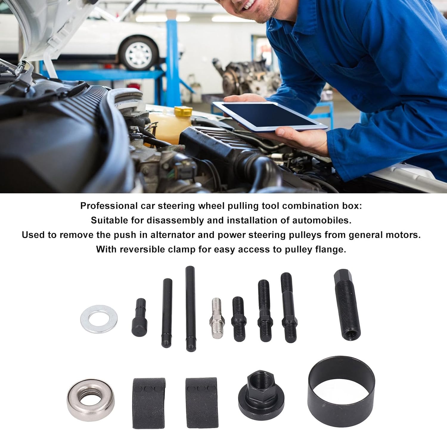 Item Type: Steering Wheel Puller KitMaterial: Iron, Carbon SteelQuantity of Tools: 14 pieces and Tool BoxTool Box Size: Approx. 23 x 20 x 6cm / 9.06 x 7.87 x 2.36inApplication: Power Steering Wheel PullerPackage List:14 x Automotive Repair Tools1 x Toolbox