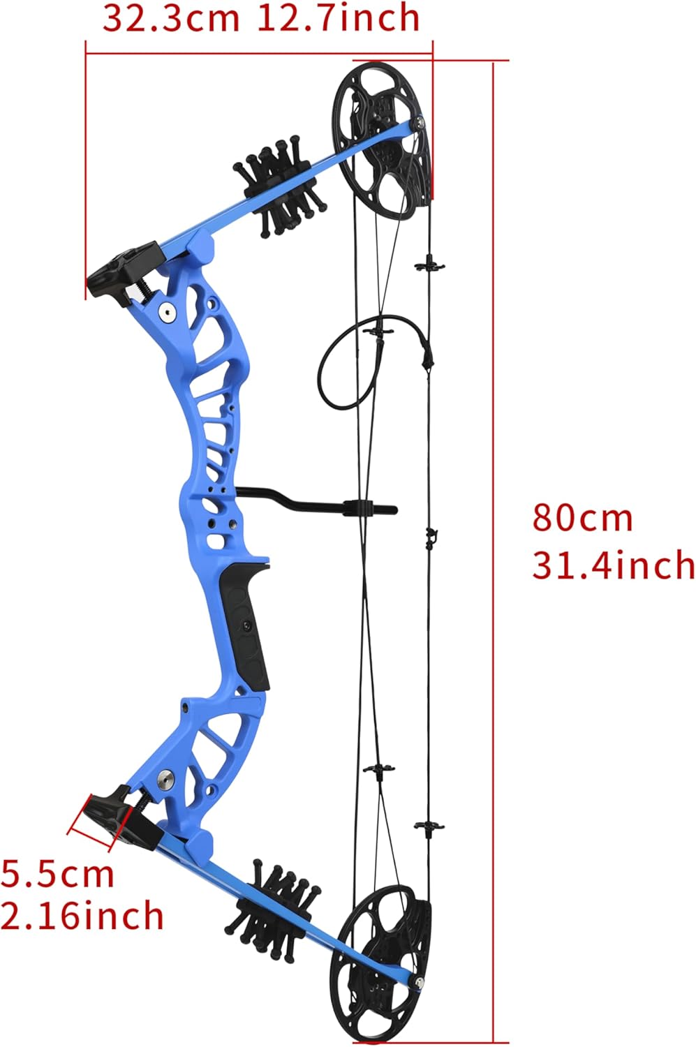 Name: Archery Compound Bow Color: Blue Material: Die casting Draw Weight: 15-45 lbs Draw Length: 18.25-29 inch Alex to Alex: 27.5 inch Brace height: 7 inch Let-off: 75% Bow Net Weight: About 1502 g Bow Size: About 80*32.3*5.5 cm Fit for: Right Hand Package: 1x Compound Bow 12x Carbon arrows 1x Bow bag 1x Sight 1x Release aids 1x Arrow rest 1x Riser stabilizer 1x Wrench 1x Bow stand 1x Wrist sling 1x Quiver 1x Bowstring wax Note: 1. The real color of the item may be slightly different from the pictures shown on website caused by many factors such as brightness of your monitor and light brightness. 2. Please allow slight manual measurement deviation for the data. 3. DO NOT DRY FIRE (shoot the bow without arrow)! This will damage the bow and hurt yourself and the people around you.