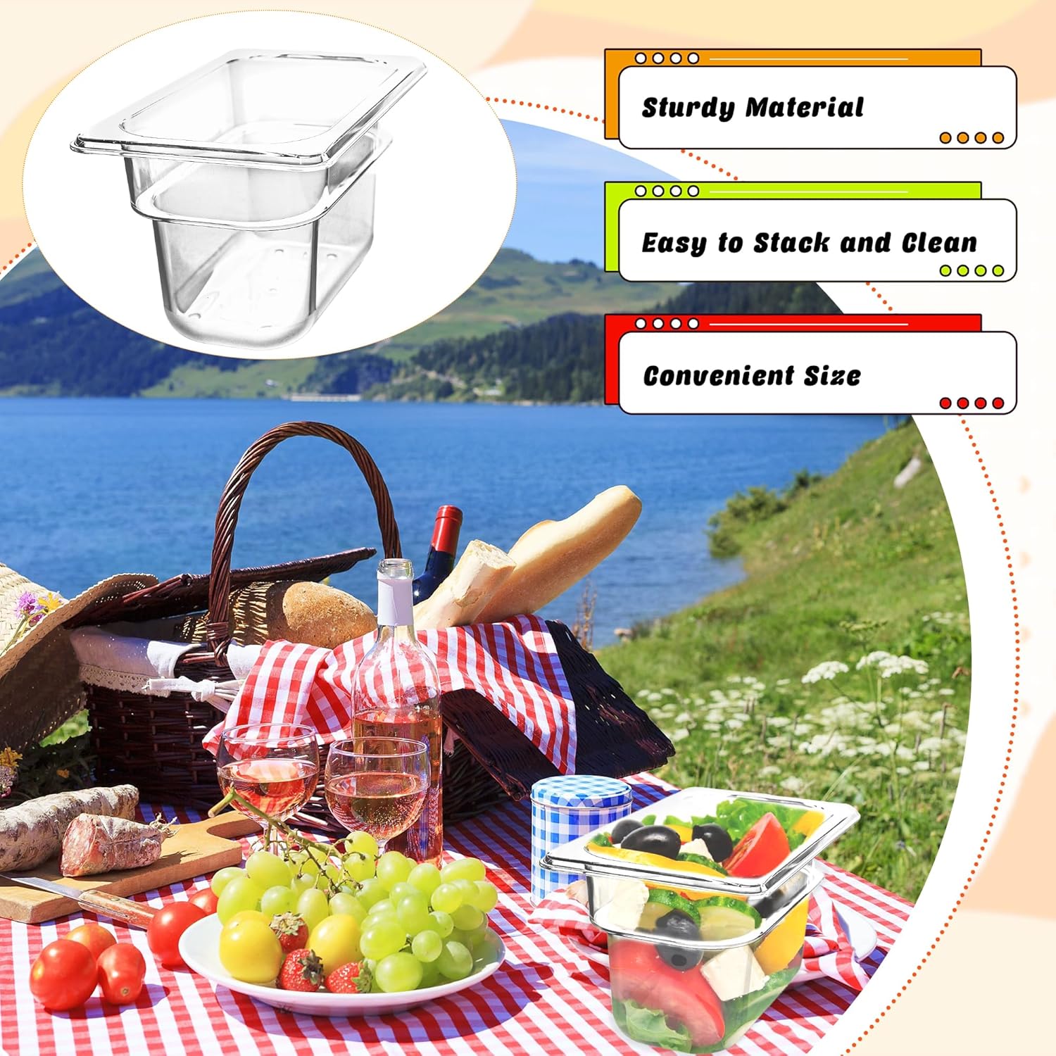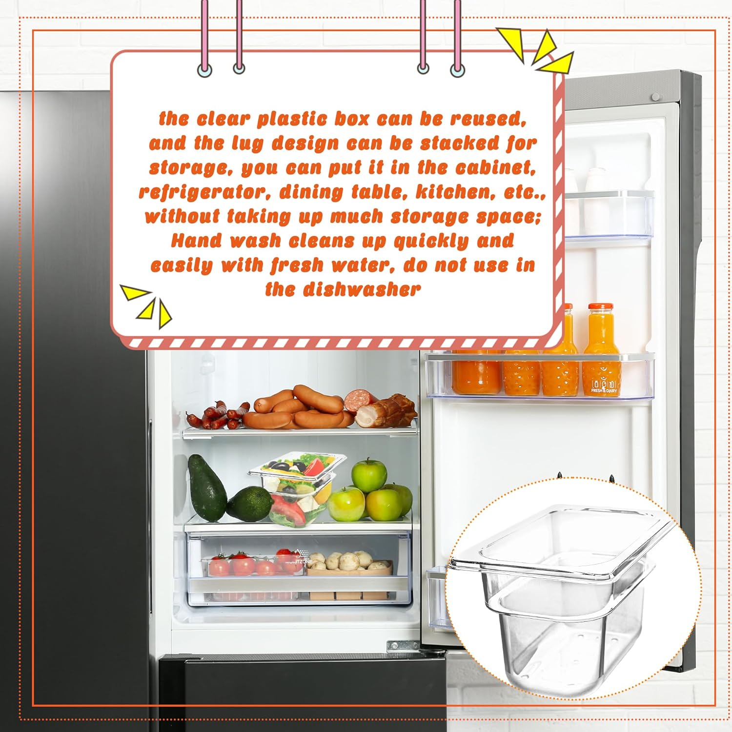 ✅Plastic Food Pan Product Details: Material: PC Size: 6.9 x 4.3 x 4 inch/ 17.5 x 11 x 10 cm Color: Clear Quantity: 15 pieces ✅Plastic Hotel Food Containers Special Feature: The clear storage pan offers excellent transparency for quick content identification, helping you showcase fresh ingredients with vibrant color while preventing cross-contamination. The stackable design maximizes storage efficiency in tight kitchen spaces ✅Packaging: 15 Pcs 1/9 Plastic Food Pan 4 Inch