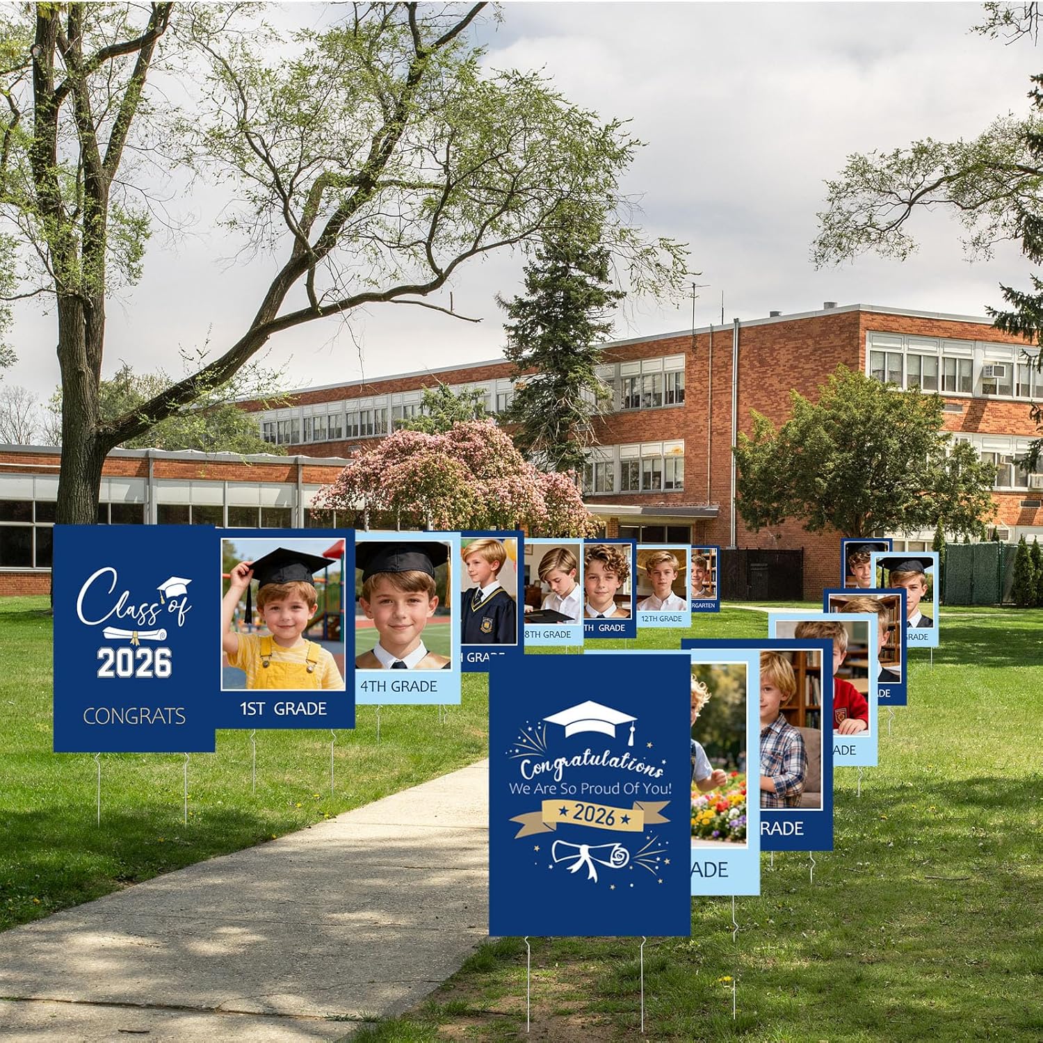 Features: Ideal photo backdrop: Bold size makes these signs ideal for group photos at grad parties. Create fun, shareable moments with classmates, family, and teachers that last a lifetime. Effortless assembly: Insert metal stakes into the lawn signboard's hollow core, and stick them into the ground, set up your grad display in minutes for instant party charm. Specifications: Material: hollow-core plastic, metal Main color: blue Size: Signboard: 42 x 30 cm/ 16.5 x 12 inch Ground posts: 38 cm/ 15 inch Package includes: 15 x Hollow-core lawn signboards 30 x Ground posts Notes: Manual measurement, please allow slight errors on size. The color may exist a slight difference due to different screen displays
