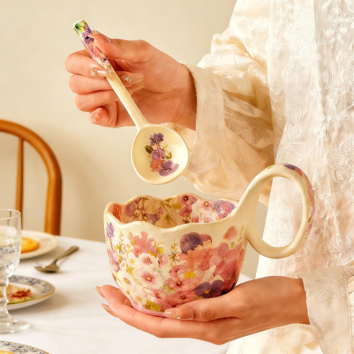 15.87 Oz Microwave Safe Soup Bowl with Loop Handle, Hand Painted A Profusion of Blooms Decor Mug Big Handle, Ceramic Soup Bowl with Spoon Great for Holding, Fruits, Cereal, Snack, Milk, Ice Cream.Soup Bowls with Handles, Soup Bowl with Handle. Hand-Painted A Profusion of Blooms Design: This soup bowls with handles features exquisite hand-painted A Profusion of Blooms motifs, paired with a matching spoon, infusing your daily meals with a fresh, natural vibe. Whether serving creamy breakfast oatmeal or hearty hot dinner stew, the vivid A Profusion of Blooms patterns add a bright pop of color to your food, filling every meal with a sense of ritual. Even when not in use, displaying it on a cabinet, dining room shelf, countertop, or dining table brings an elegant charm to your space. Ceramic Loop Handle Soup Bowls Material: Crafted from premium ceramic clay and high-fired at 1346°C (2455°F), it boasts enhanced density and exceptional wear resistance for long-lasting durability, resisting scratches and chips. In addition, soup bowls with handles its non-stick surface makes cleaning a breeze and maintenance hassle-free. Wonderful Gift For Women: This soup bowl with handle showcases an amazing hand - painted pattern, vividly featuring bright A Profusion of Blooms that seem to bloom with vitality. it's not only a practical tableware item for enjoying soups, but also a wonderful holiday gift. Whether for a lady, a mother, or other relatives, this beautifully designed soup bowl is sure to bring delight and add a touch of artistic charm to their dining experience. A Profusion of Blooms Pattern Soup Mug: This soup mug and spoon set delights the eyes with its exquisite A Profusion of Blooms patterns. The mug’s wavy rim adds a touch of playfulness. soup bowl with handle The ergonomic curved handle fits the natural curve of your palm, ensuring a comfortable and secure grip even when holding hot soup. The matching spoon is also adorned with delicate A Profusion of Blooms motifs, perfectly echoing the vibrant A Profusion of Blooms patterns on the mug and ceramic soup bowl, creating a harmonious and charming visual effect. Ideal soup bowl for Multi-use:This ceramic soup bowl with handle is a versatile stunner that blends practicality with beauty. It’s perfect for serving fruits, nuts, candy, ice cream, appetizers, snacks, olives, salsa, and more. Whether you’re pouring milk, coffee, tea, hot chocolate, or other beverages, it’s just the right fit. When not in use, it doubles as a charming decorative bowl for small flower arrangements, adding a fresh touch to any space.A wonderful gift choice for women on Mother’s Day,Grandma’s birthday,Thanksgiving,or Christmas