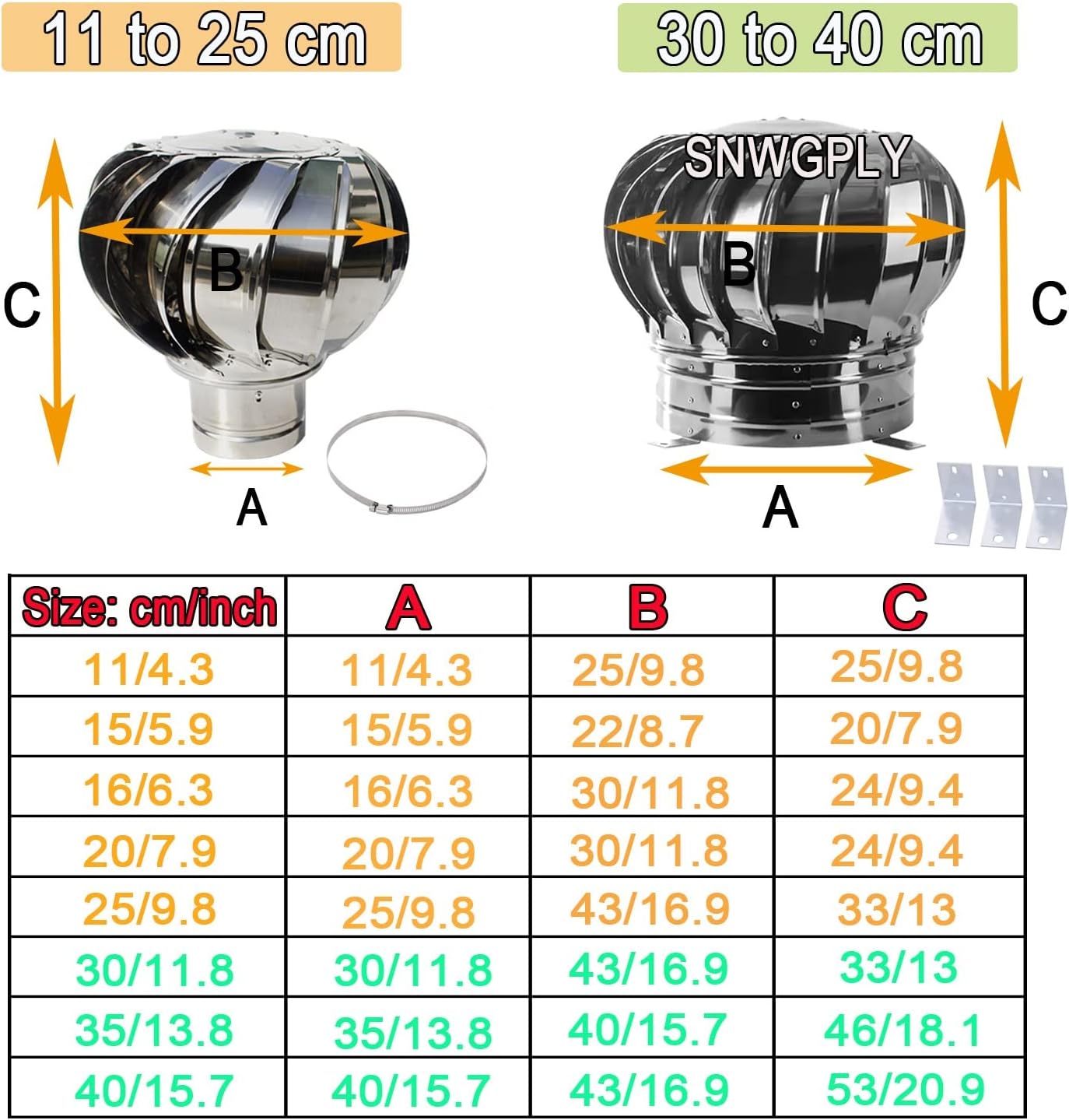 Fireplace chimney tops, stainless steel swivel chimney caps, chimney mouths, chimney caps, chimney tops to withstand weather changes and provide a steady draft for the chimney in bad winds Dimensions 4.3inches (110mm) incl. 1 clamp 5.9inches (150mm) incl. 1 clamp 6.3inches (160mm) incl. 1 clamp 7.9inches (200mm) incl. 1 clamp 9.8inches (250mm) incl. 1 clamp 11.8inches (300mm) incl. 3 fixing feet 13.8inches (350mm) incl. 4 fixing feet 15.7inches (400mm) incl. 4 fixing feet Name: Non-powered wind cap (chimney hood) Material: 304 stainless steel (internal components galvanised) Advantages 1. Improves indoor air quality 2. Prevents backflow of smoke and has a deflecting effect 3. Wind rotation, saving energy 4. Improves exhaust gas emissions 5. Protects the chimney hood from rain andmoisture Packaging 110 to 250 mm: vent cap x 1 piece with 1 clamp 300 mm: vent cap x 1 piece with 3 fixing feet 350 to 400 mm: vent cap x 1 piece with 4 fixing feet Notes 1. The larger the size, the greater the number of blades and the more dense they are 2. Please take care when unpacking and installing and wear gloves to avoid scratches 3. If you have any questions about the product, please contact us, we are pleased to serve you