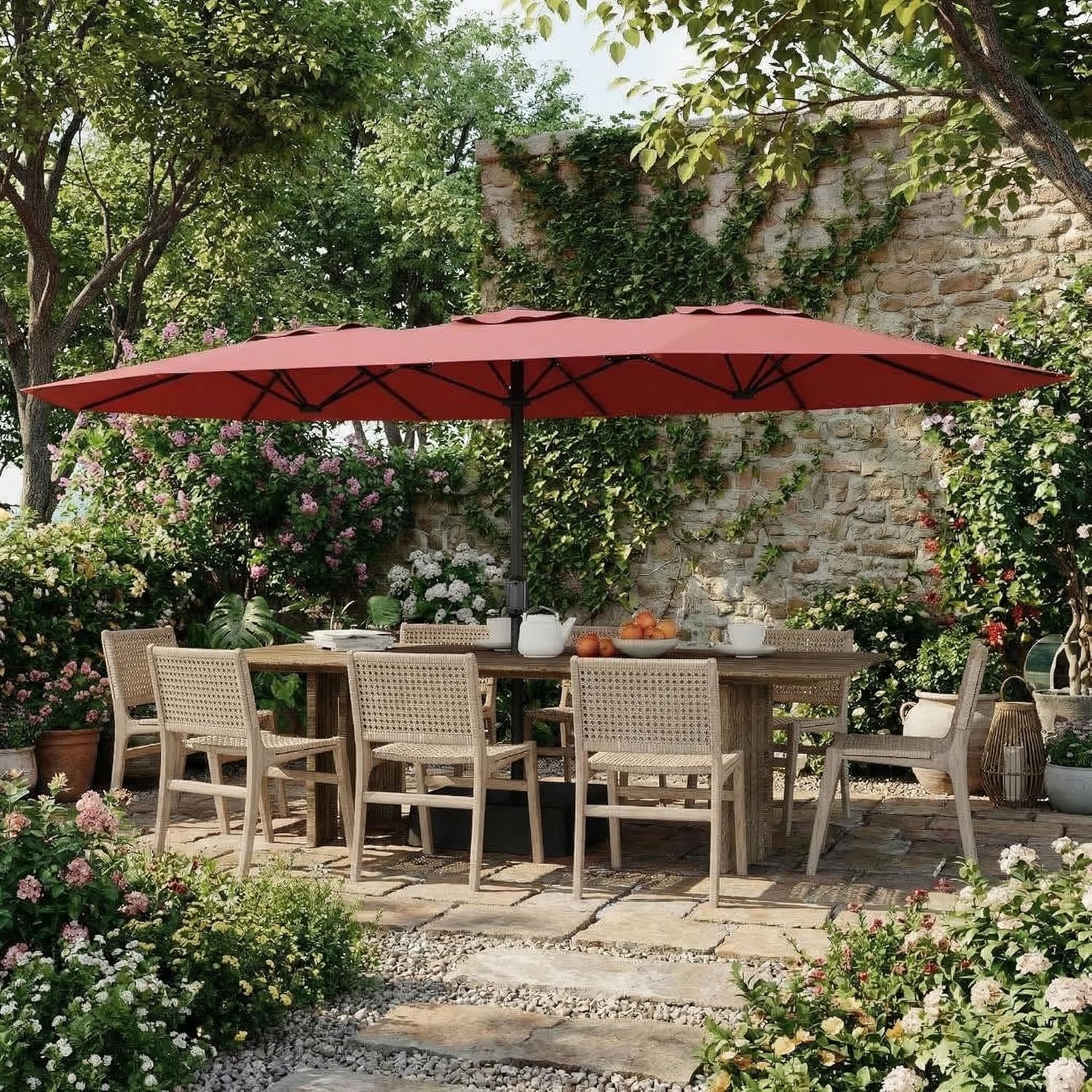 Double‑Sided Large Patio Umbrella – UV & Water Resistant, Steel Ribs, Manual CrankKey Features:Spacious Coverage for Any Outdoor Setting: This large patio umbrella offers generous double‑sided shade, perfect for family patio tables, poolside lounging, or outdoor gatherings. The expansive pool umbrella provides reliable coverage for all your summer activities.UV‑Resistant & Water‑Resistant Canopy: The outdoor patio umbrella cover is made of premium 100% polyester fabric with a PTFE coating designed for sun protection and water resistance. This market umbrella stays dry with just a gentle shake before closing, ensuring lasting performance.Steel Ribs & Sturdy Stand: Equipped with sturdy ribs and a matching umbrella stand, this patio umbrella ensures stability and durability. The steel horizontal bars hold the rectangle canopy firmly in place, preventing sagging or wobbling during use.Easy Manual Crank Operation: This outdoor patio umbrella features a manual crank handle for easy opening and closing. Simply turn the crank to smoothly raise or lower the large canopy without any heavy lifting—making daily operation quick and convenient.Versatile Design for Multiple Locations: Designed specifically for outdoor use, this market umbrella provides reliable shade and sun protection for backyard patios, pool areas, beaches, or markets. The versatile pool umbrella enhances any outdoor space with style and function.