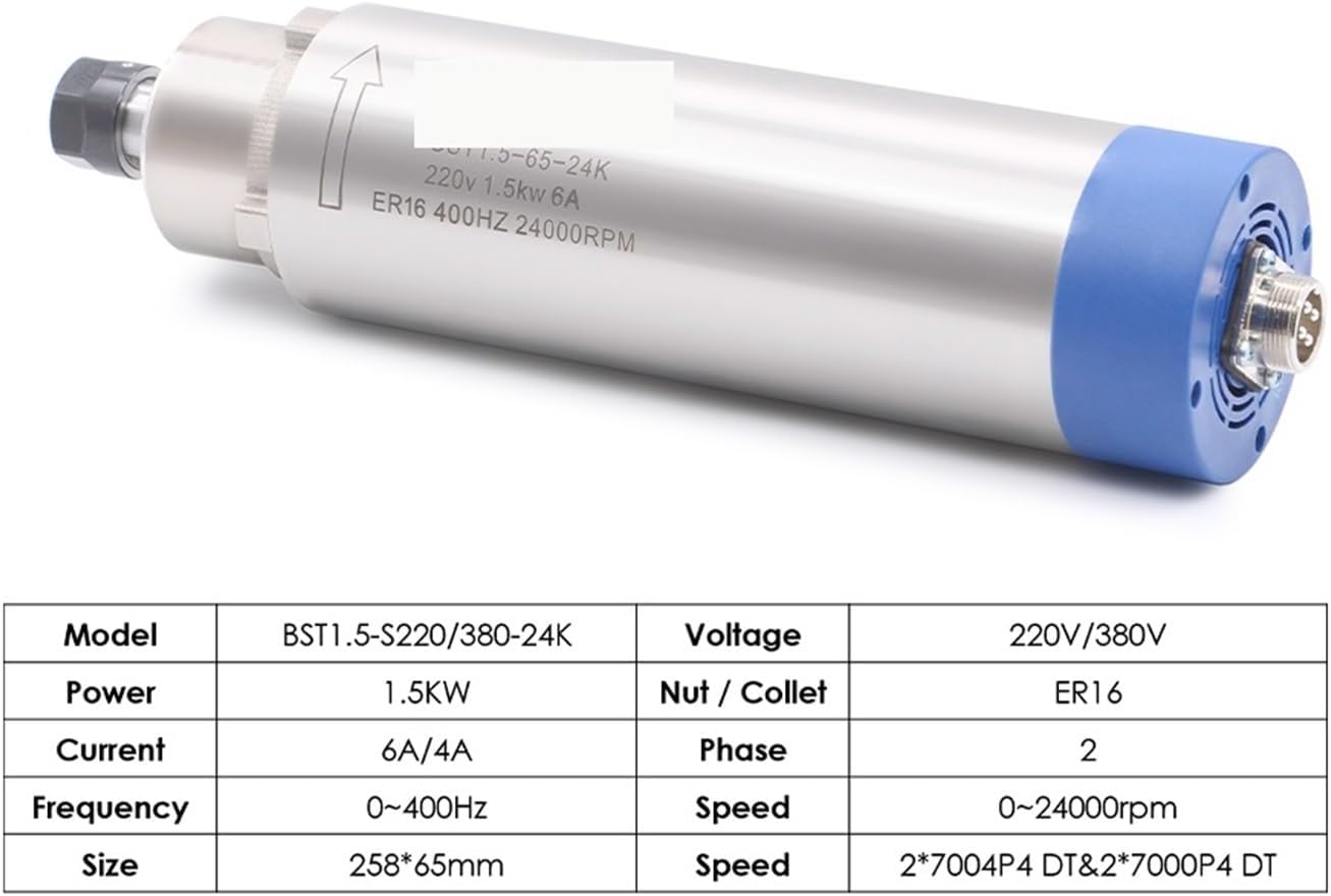 MandrelsBasic parametersSize 65x258mm (body diameter 65mm; length: 258mm)Speed regulation method: Through the three-phase inverter output, adjust the inverter frequency to change the spindle speed.Cooling method: air coolingPower interface: H17-4 pin waterproof aviation is optional. Aviation plugs marked with "1", "2", "3", and "4". "1", "2", and "3" are connected to the inverter U, V, and W interfaces respectively, and 4 is connected to the inverter ground.Power: 1.5kw (1HP=0.735kw)Frequency: 0-400HzSpeed: 0-24000rpmRunout deviation: 0.01mm4 fully sealed P4 angular contact ball bearingsBearing type: 2 x 7004P4 DT & 2 x 7000P4 DTAir-cooled ER16 chuck blockClamping knife diameter 10mm9mm8mm7mm635mm6mm,5mm,4mm,3.175mm,3mm,2mm,1mmGrease lubrication