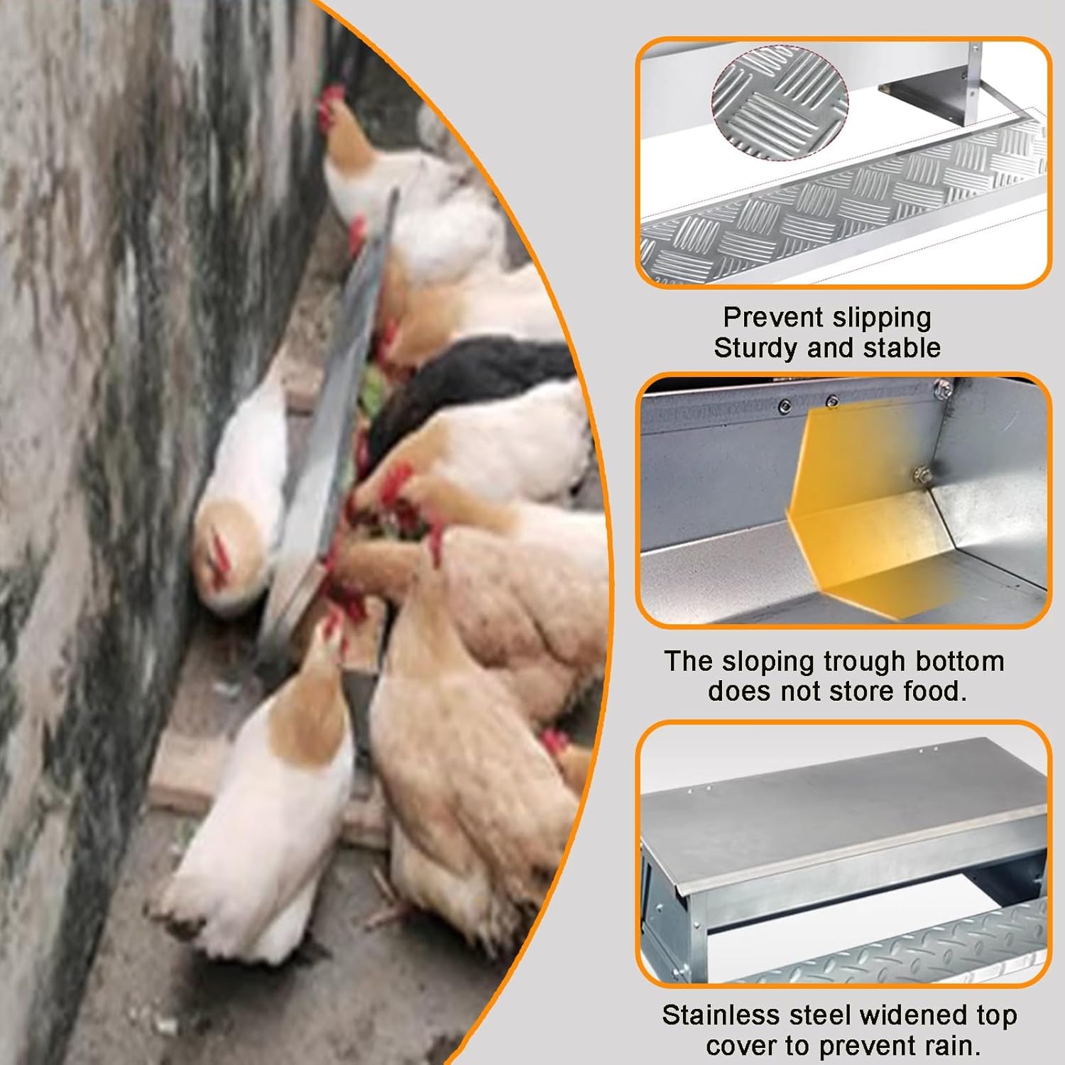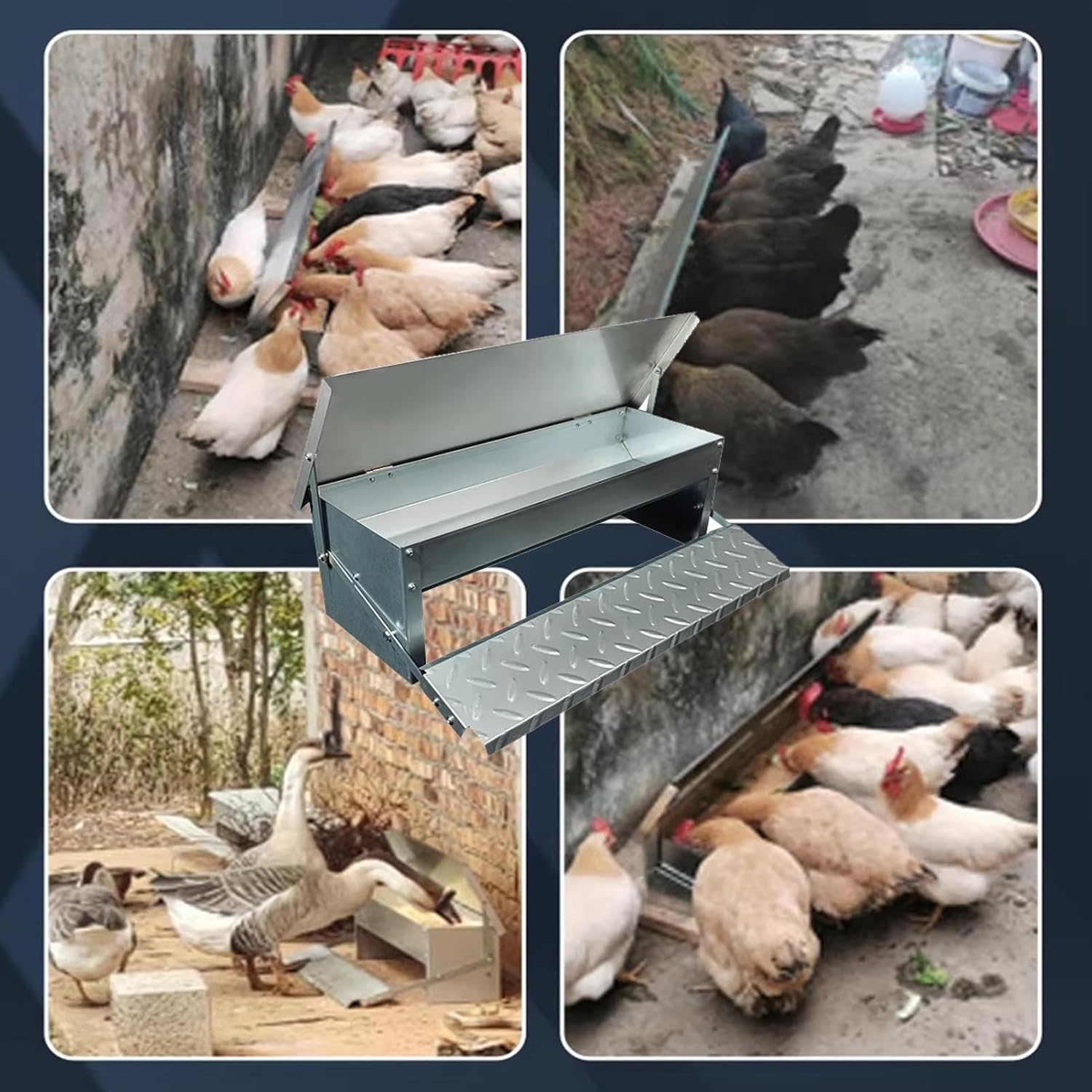 Brand:XILYZMOFeatures: 1. No to worry about poultry being unattended even after traveling for several days; the pedal design allows for easy opening and feeding.2. The pedal design relies solely the animal's own strength to open and feed, the food from getting wet; the lid automatically closes when no force is appliedName: Bird Feeders / Outdoors Bird Feeder / Spill Proof Cardinal / Small Bird Feeder / with Integrated Seed Catcher Tray / Metal Chicken Water Feeder / Pigeon Feeder Food / Dispenser Removable DispenserMatériau : Couvercle en acier inoxydable (autres pièces en tôle d'acier galvanisé de 0,7 mm d'épaisseur)Material: Stainless steel lid (other parts are 0.7mm thick galvanized steel sheet)With lid: YesStyle: Single-sided/Double-sidedCapacity: Single-sided can hold approximately 8 catties of feed / Double-sided can hold approximately 15 catties of feedAutomation level: Semi-automaticCleaning : Manual cleaningInstallation : typeVoltage requirement: No voltage requiredProduct dimensions: Length 56 cm, Height 18 cmWeight: Single-sided model weighs approximately 2.7 kg; Double-sided model weighs approximately 5.24 kgApplications: Suitable for poultry farms, including chickens, ducks, geesePackaging: 1 x Pigeon Feeder