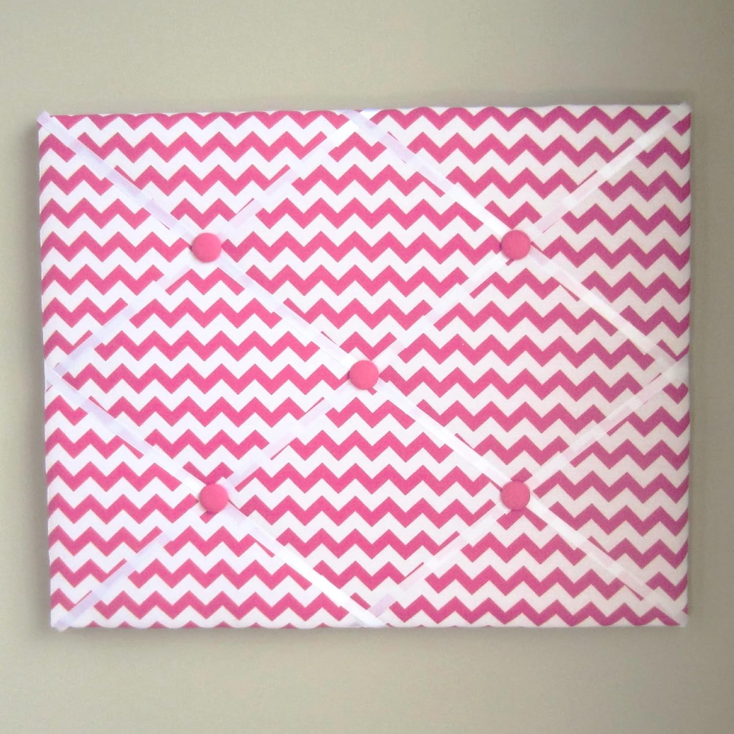 This 16"x20" memory board is so pretty in a fabric with pink & white chevron. The fabric is accented with a white satin ribbon and hot pink buttons. Handmade fabric memory boards are designed to be used without tacks or push pins. Great for: *Organizing photographs (your own or all those Christmas photo cards!) *Organizing business cards *Hanging hair accessories or jewelry *Safely storing your household bills *Organizing the million slips of paper covering your desk! This memory board is made with designer fabrics and top quality materials. The back is finished with a felt back and ribbon. Each memory board has a saw tooth hanger on the vertical and horizontal sides. Due to the many variations in monitors and browsers, color samples may appear different on different monitors. Computer monitors are not all calibrated equally and color reproduction on the Internet is not precise. Since it is not possible to guarantee our online colors will look the same on all computers, we do not guarantee that what you see accurately portrays the color of the actual product