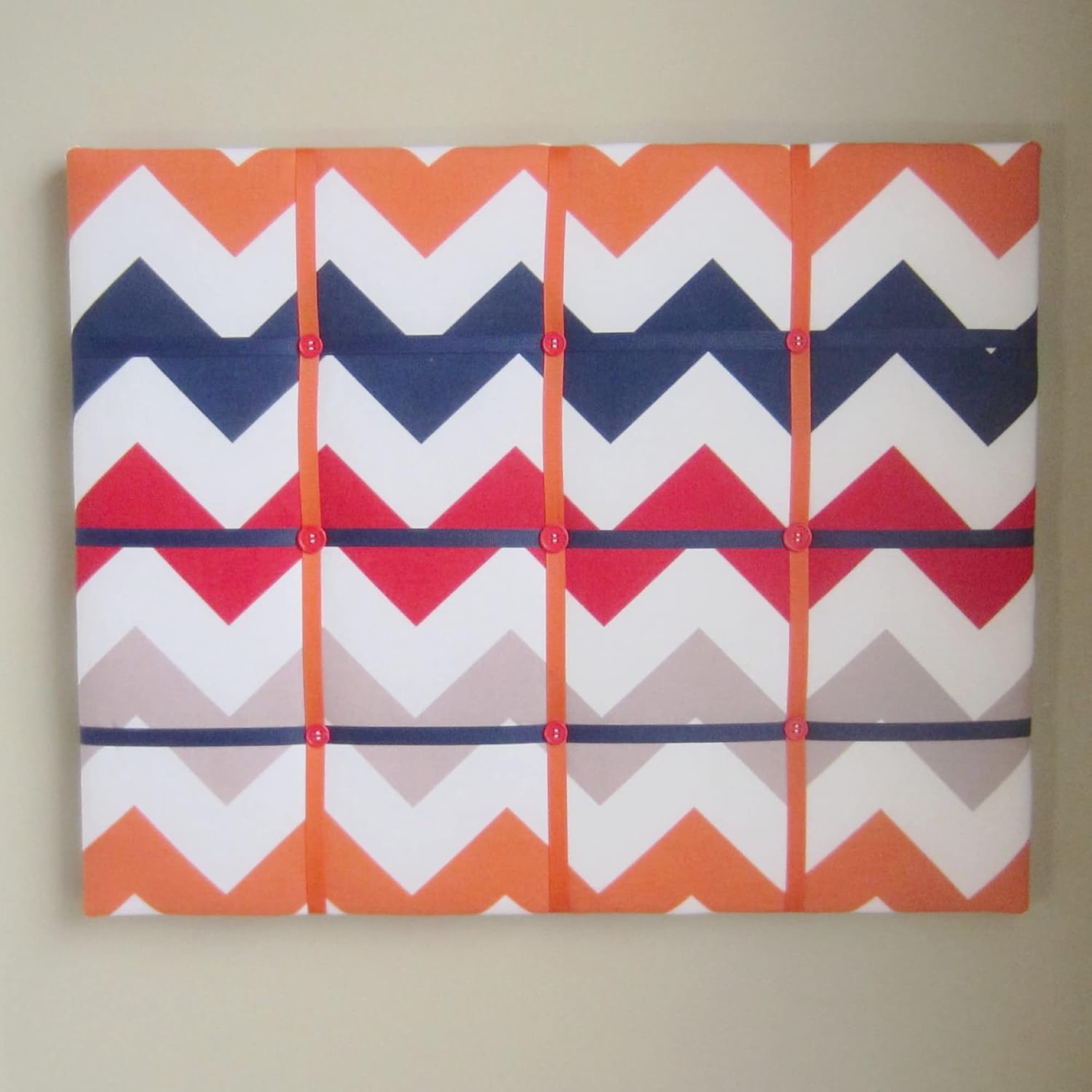 This 16"x20" memory board is covered in a red, navy, and orange chevron fabric. The ribbons are orange and navy grosgrain. The buttons are red. Handmade fabric memory boards are designed to be used without tacks or push pins. Great for: *Organizing photographs (your own or all those Christmas photo cards!) *Organizing business cards *Hanging hair accessories or jewelry *Safely storing your household bills *Organizing the million slips of paper covering your desk! This memory board is made with designer fabrics and top quality materials. The back is finished with a felt back and ribbon. Each memory board has a saw tooth hanger on the vertical and horizontal sides. Due to the many variations in monitors and browsers, color samples may appear different on different monitors. Computer monitors are not all calibrated equally and color reproduction on the Internet is not precise. Since it is not possible to guarantee our online colors will look the same on all computers, we do not guarantee that what you see accurately portrays the color of the actual product