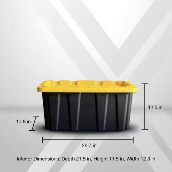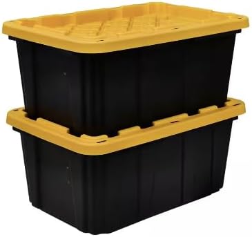 This heavy-duty 17-gallon tough tote is tailored to meet all your storage requirements. The recessed lid allows effortless stacking of multiple units, while the tapered design facilitates convenient nesting when not in use. Crafted from high-grade resin, the sturdy black base, and the yellow snap lid ensure the safety and protection of your items. Perfect for meticulous organizers in need of premium storage solutions, this tote features integrated slots for locking to deter unwanted access, and its unique tie-down channels make it easy to secure for hassle-free transport. Additionally, it is compatible with most hitch-mounted cargo carriers. The gallon size is clearly visible on both the lid and the base for easy recognition.