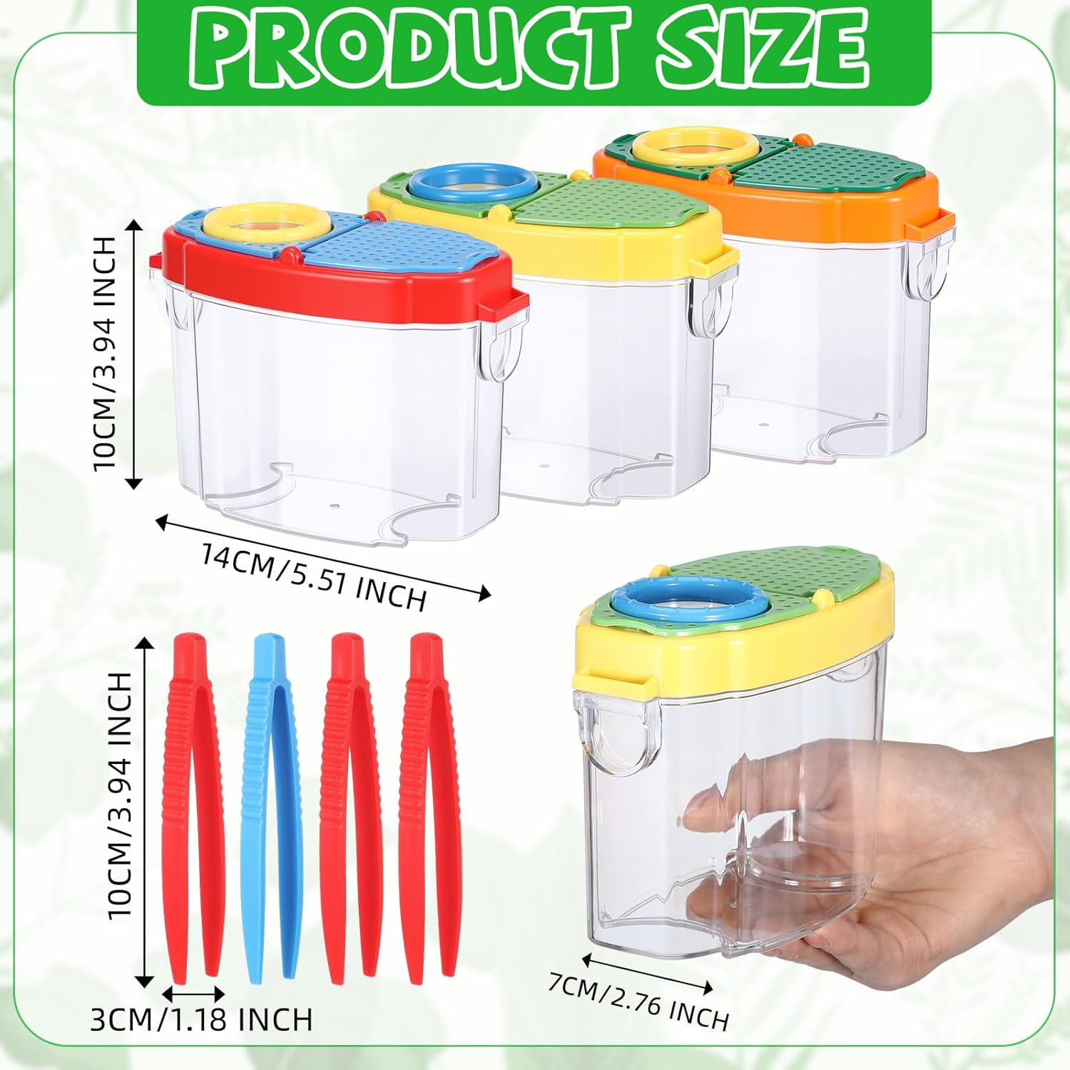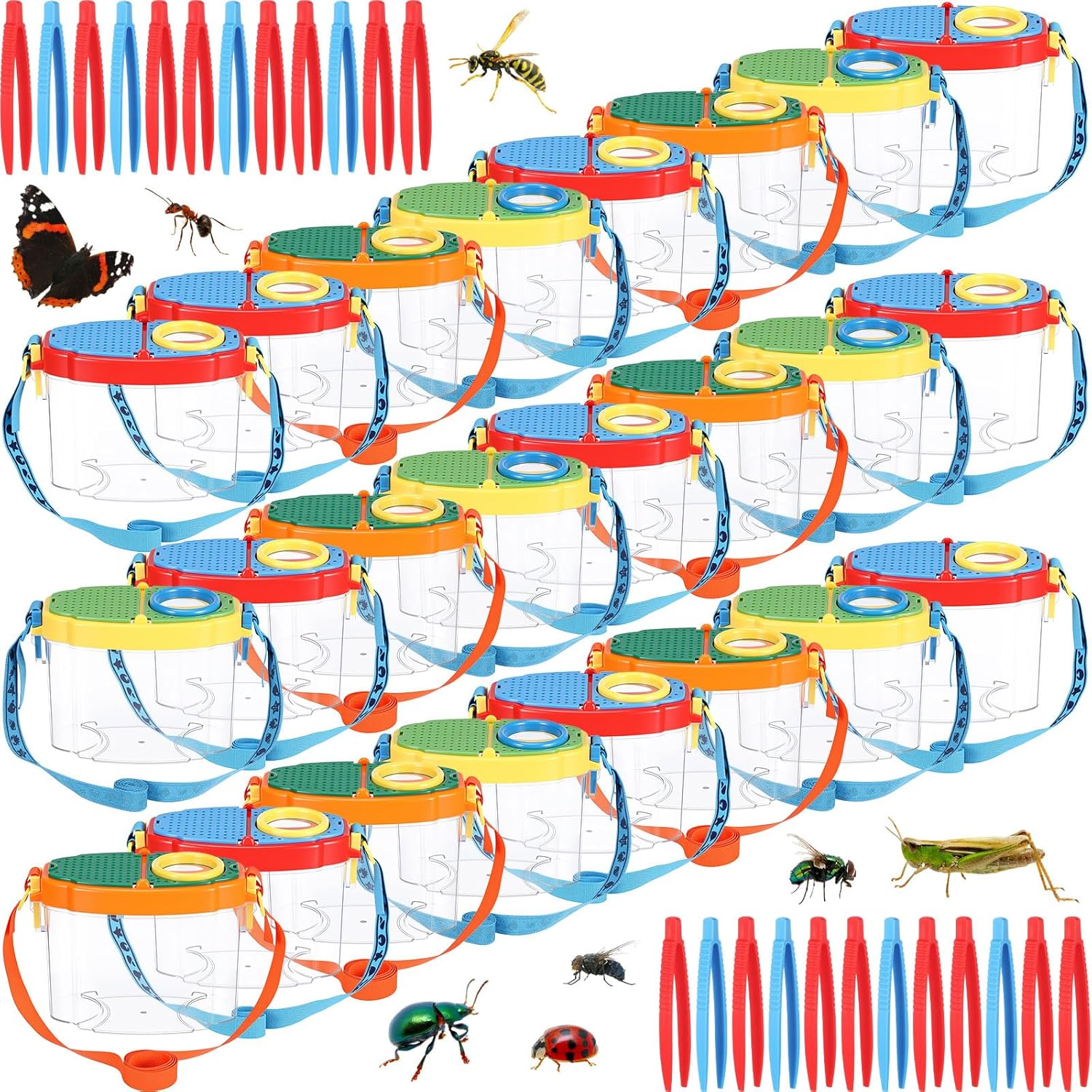 Features: Portable Design for Outdoor Adventures The lightweight bug box is easy to carry on nature walks, camping trips, or backyard explorations. Its durable construction stands up to outdoor use while providing a secure temporary home for insect discoveries. Ideal Gift for Young Nature Enthusiasts This comprehensive bug collection kit makes a wonderful present that combines entertainment with education. It encourages children to engage with nature, stimulates curiosity about science, and provides hours of constructive outdoor fun. Specifications: Material: plastic Color: red, yellow, orange Size: 14 x 10 x 7 cm/ 5.5 x 4 x 2.8 inches Package includes: 18 pcs bug catcher 18 Pcs bug tweezer Notes: Manual measurement, please allow slight errors on size. The color may exist a slight difference due to different screen displays.