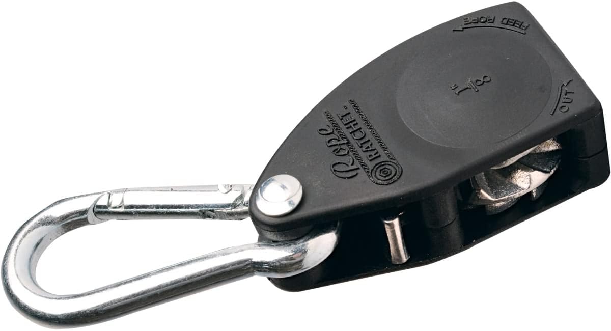 Hydrofarm's new compact rope ratchets (2 per pack) are perfect for hanging lights, filters, and other equipment. They have metal components for long life and strength, and the patented pully system pulls tight, locks in place, and adjusts easily. Each ratchet holds 75 lbs. so the pair can handle jobs up to 150 lbs.Carabiner clips make attaching or removing equipment a snap.Comes in attractive clam shell packaging.Includes:2 ratchets4 easy-to-use carabiner clips2 six-foot cords