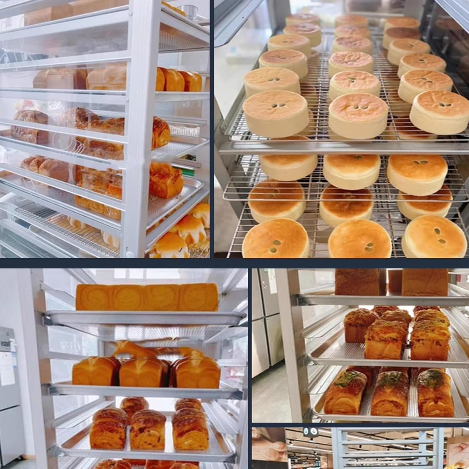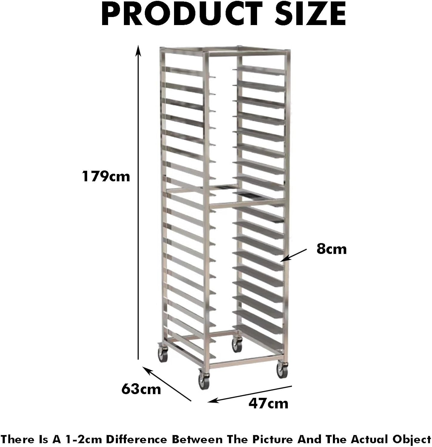 The commercial bread baking tray rack is expertly designed to accommodate 40x60 cm baking trays, making it an essential addition to any bakery, kitchen, restaurant, cooking school, or cafeteria. This versatile rack is perfect for holding various types of baking trays, including stainless steel, bread, dinner, and pizza trays, enhancing your baking efficiency. **Key Features:** 1. **Robust Aluminum Alloy Frame:** Crafted from thickened aluminum alloy, this rack boasts a strong load-bearing capacity, supporting over 20 kg per layer and an impressive overall capacity of 300 kg. The stable stacking ensures that your baked goods are safely stored without any wobbling. 2. **Effortless Mobility:** Equipped with four universal silent wheels, our rack allows for smooth 360° steering. This design facilitates easy maneuverability, making it simple to transport your goods without any jamming, ensuring a safe and efficient workflow. 3. **Stylish and Functional Design:** The sleek, metal texture of this rack not only enhances your kitchen or baking studio's aesthetics but also provides a practical solution for organizing your utensils. Its neat shelf display allows for quick access to your baking essentials, merging beauty with functionality and creating an improved working environment for discerning users. **Specifications:** - **Product Name:** Bakery Rack / Commercial Bakery Racks with Wheels / Racking Trolley Storage - **Color:** Silver - **Material:** Aluminum Alloy - **Product Size:** As shown in the picture - **Product Layers:** Options available for 9, 18, or 20 layers - **Applicable Occasions:** Ideal for kitchens, bakeries, showrooms, dessert shops, hotels, and homes **Package Includes:** - 1 x Bakery Rack - 1 x Installation Accessories Set For any inquiries regarding this product, please feel free to reach out to us. **Warm Tips:** 1. Manual measurements may vary by 1-2 cm; please refer to the actual product. 2. There may be slight colo...