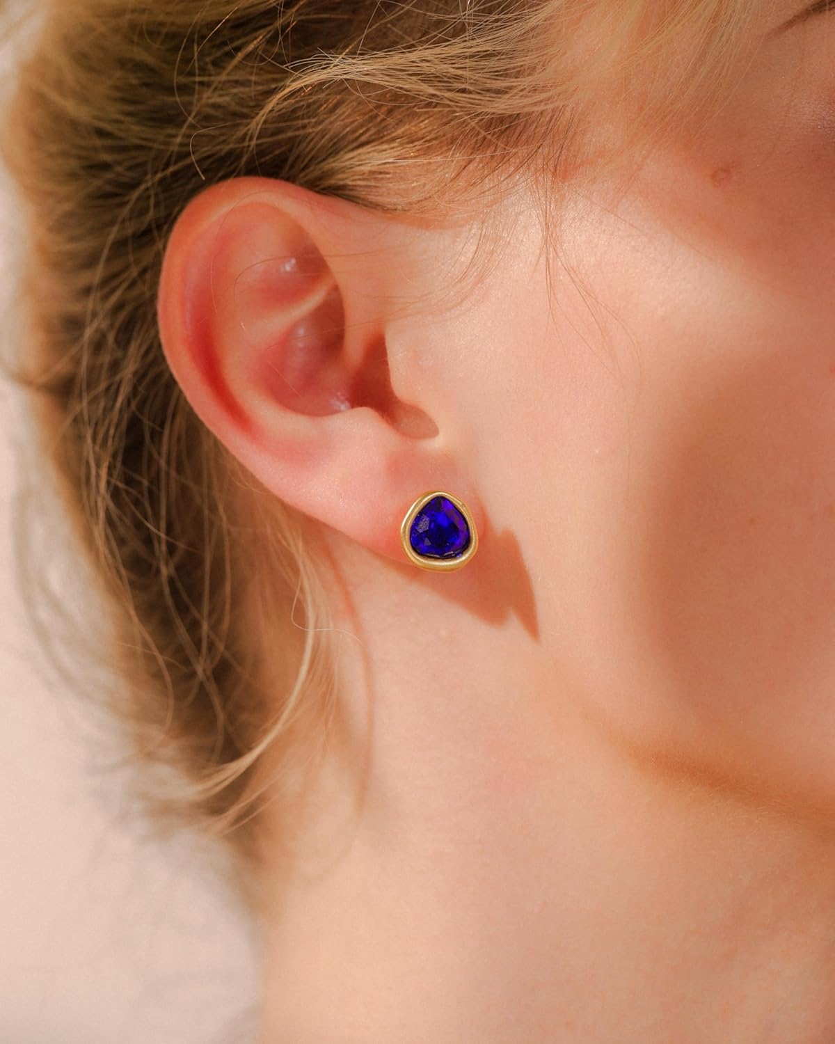 Welcome to a world of refined elegance with our Abstract Austrian Crystal Stud Earrings! Each pair, measuring 0.4 inches in both length and width, showcases beautifully sparkly Austrian crystals nestled in amorph shaped gold frames. These elements combine to add a burst of fun and joy into any ensemble, making them a true standout accessory. Crafted with meticulous attention to detail, these earrings feature posts made from 925 sterling silver and are adorned with an opulent 18k matte gold plating, ensuring durability and lasting charm. Each earring is remarkably lightweight, weighing just 0.08 oz, offering comfort for all-day wear. The design includes a unique hammered texture on the back of each earring, ensuring that your style is as unique as you are. Available in eight vibrant colors—aquamarine blue, emerald green, ruby red, morganite pink, citrine yellow, clear, royal blue, and lilac—there’s a perfect match for every mood and occasion. Perfect for perking up your daily office attire or complementing your breeziest summer dress, these earrings are your new go-to pals. Embrace the playful charm and understated elegance of our Austrian Crystal Stud Earrings and turn every day into a sparkling celebration. It’s time to elevate your jewelry game and add a splash of pizzazz to your ensemble with these irresistible beauties!