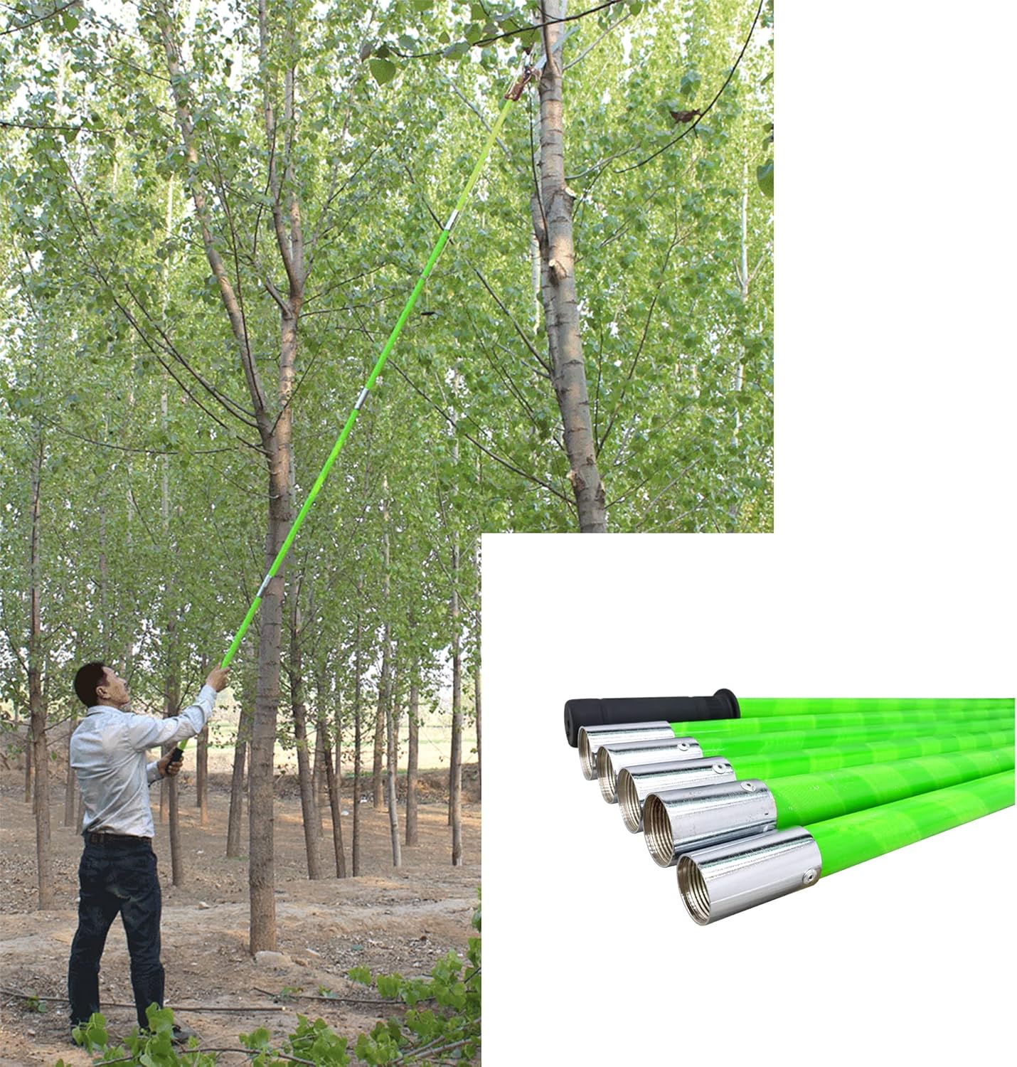 This pole saw not only can use for reach and cut branches but also can use to print your house, wash window,etc.It is optional for you to install a 14" detachable saw blade mounted on top pruner for cutting large and thicker branches. Durable steel body, 8 foot rope and pulley operated spring action pruning, carbon steel hardened pruner blade for shearing smaller branches.The hole of this pruner head is suitable for fit any 25mm diameter telescopic rod. Simply install this saw bit into the pruner head to converts it to a pole saw for pruning high and hard to reach branches, even allow you pruning tall trees, trim overhead without a ladder or at ground level without bending or kneeling. Now pruning your own tree has become more safety and easy than before.Item:211072