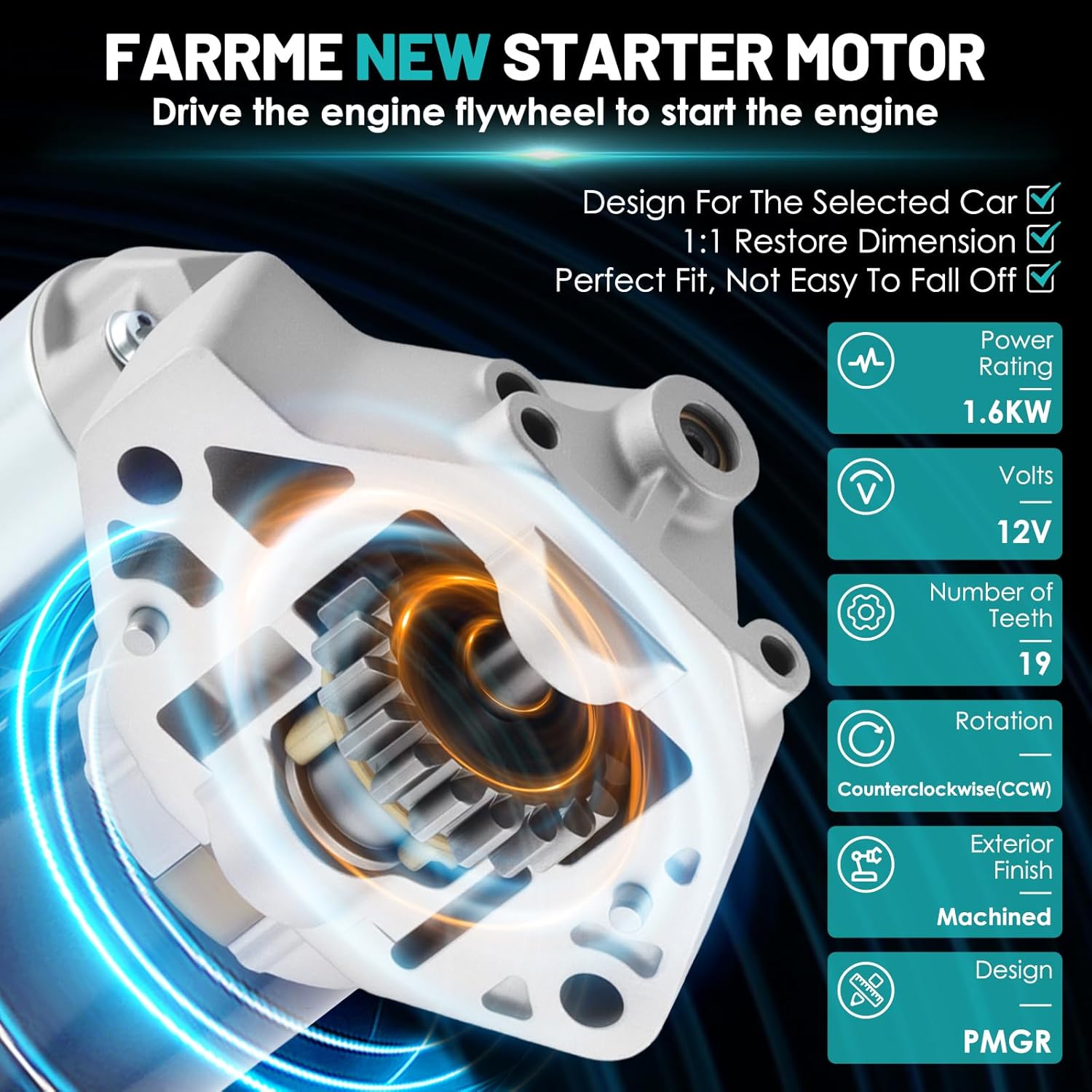 Reliable power at your fingertips: Upgrade with Farrme high-performance starter motor!Starter Replacement Part Number:19008N, 19008, 31200GLYA02, 31200RGLA02, M000T15771ZC, MHG027,31200-GLY-A02, 31200-RGL-A02, 31200-RGL-A02RM, MHG027, M000T15771,M000T15771ZC, M000T15771ZCKDCar Starter Specification:All of our starters are tested to ensure product performance and durabilityPart Type: StarterVoltage: 12Power Rating: 1.6KWRotation: CCW (Counterclockwise)Number of Teeth: 19High Torque Starter Compatibility:REPLACEMENT FOR or COMPATIBLE WITH Honda:for Honda Odyssey 2007-2007 V6 3.5Lfor Honda Odyssey 2008-2010 V6 3.5L, w/o Variable Cylinder Management EngineNote: Before purchasing a new starter motor, please verify the part number, OEM car starter pictures, specifications, vehicle make, model, and engine type to ensure this is the correct automotive replacement starter starters for your car.New Car Starter Motor Feature:1. Reliability: The car starter motor is designed and manufactured to provide high reliability, ensuring consistent engine starting in various conditions.2. Efficiency: The starter motor efficiently converts electrical energy into mechanical energy, delivering sufficient torque and speed for quick engine startup.3. Durability: Built with durable materials and precision engineering, the starter motor exhibits long-lasting performance, capable of withstanding frequent start cycles and harsh environmental conditions.4. Quick Start: Equipped with quick-start capabilities, the starter motor rapidly responds and initiates engine ignition, reducing wait times and unnecessary delays.5. Precise Control: Advanced control systems in the starter motor enable precise current regulation and smooth startup processes, ensuring reliable and controlled engine ignition.When to replace car starter motor:1. Difficulty Starting: Difficulty starting the car, requiring multiple attempts before it successfully starts.2. Unusual Noises: Hear grinding sounds, harsh metallic friction noises, or any other unusual sounds when starting the car.3. Power Issues: When turning the key or pressing the start button, if the engine fails to start or only produces clicking sounds without the normal cranking noise.【Important Tips】Farrme starter motors are brand-new and undergo 1OO% testing.Q1: The car has a new starter but won't start and makes a clicking sound.A1: In this situation, we must consider whether the fuel pump is damaged. A damaged fuel pump can cause a lack of fuel pressure during startup, resulting in the vehicle not starting.Q2: After replacing the starter with a new one, there is still a lot of noise.A2: The old starter damaged some teeth on the flywheel ring gear. So when we install a new starter, it may not fit perfectly with the ring gear, resulting in loud noise and difficulty starting. When replacing the starter, it is recommended to check the flywheel ring gear; otherwise, the new starter may not last long either.Q3: After replacing the car starter, the car won't start.A3: If the car battery is low, the car may not start. If the battery is not the issue, it is likely a problem with the ignition system. Insufficient voltage from the battery can also make it difficult to start the car.