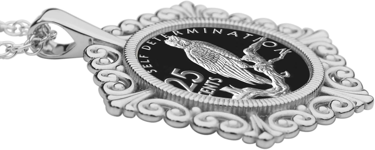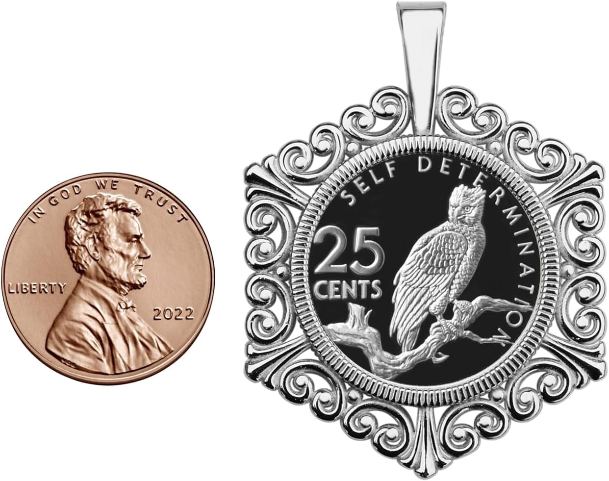 You are looking at a gorgeous 925 sterling silver necklace with an authentic1976 Guyana 25 Cent Gem Proof Coin, Harpy Eagle. The bezel frame is well designed with classic scrolls, about 42mm(1.65") x 32mm(1.26"), and made of solid 925 sterling silver. I designed and made this pendant myself, which is a brand new one and has never been worn or used before. It comes with a 20" 925 sterling silver double rope chain and also a gift box, so the pendant is ready to wear when it arrives. I hope you end up with one of these beautiful coin necklaces. This necklace will be great for gift, investment purpose or just adding to your coin/jewelry collection. I will be happy to combine shipping for multiple items. Both chain and pendant are marked 925 sterling silver. Thanks!