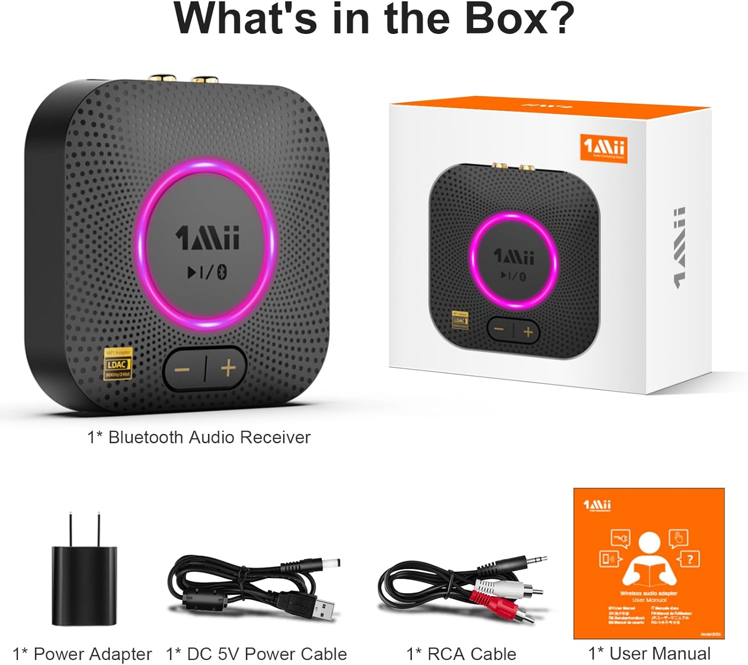 | Other Special Features of the Product | 50-100ft Bluetooth Distance without Signal/Audio Cut-Out, Enjoy Hi-Res Audio with 1mii LDAC Bluetooth Receiver, Featuring the lastest Qualcomm 5.2 Chip, Low Latency & aptx-HD ensure Zero Delay HD Music, Supports 3.5mm AUX & RCA Outputs / Volume Control / Track Playlist |