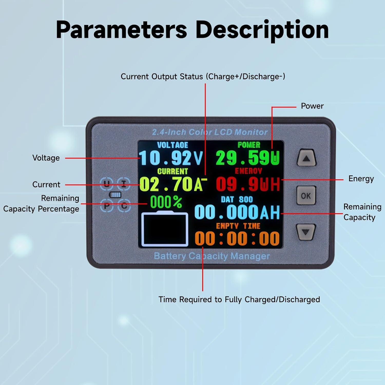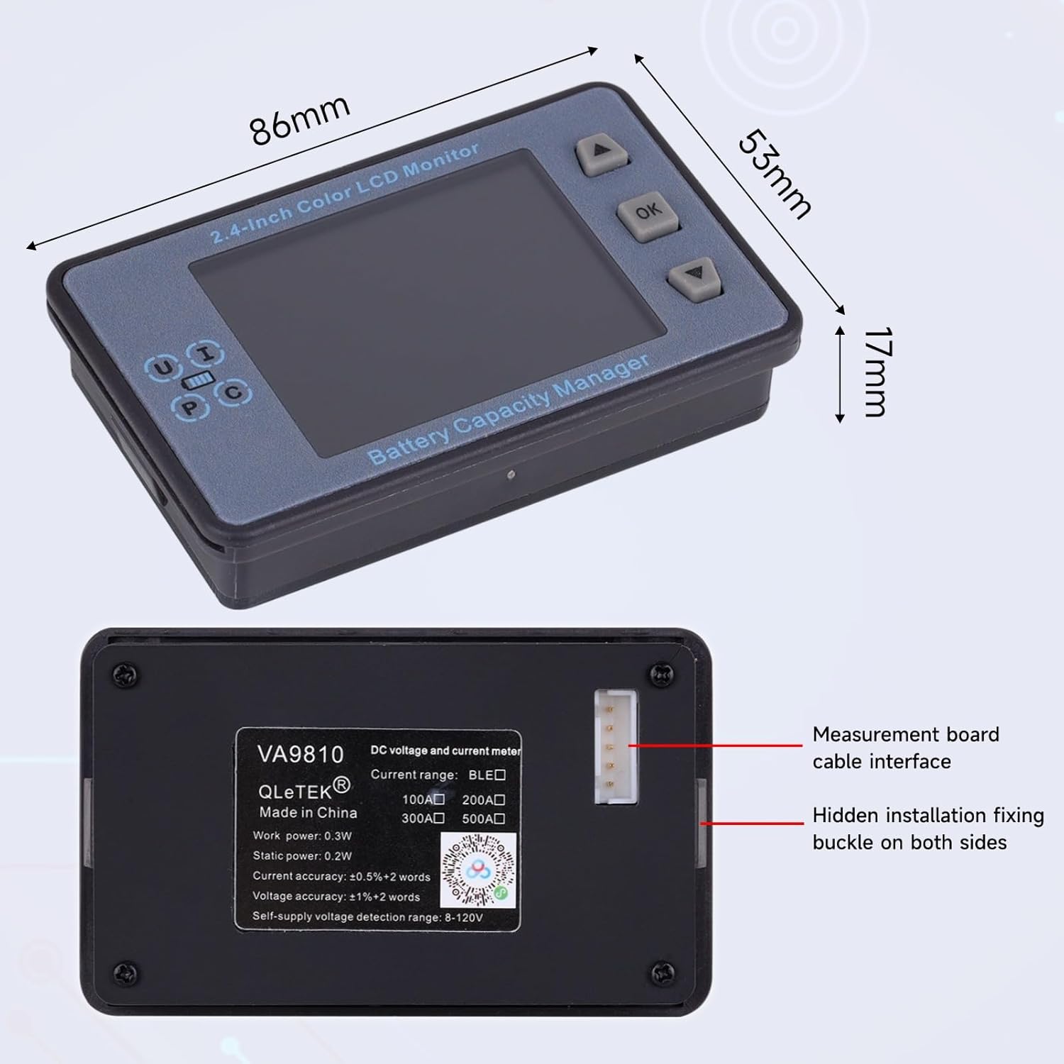 DC 8-100V Coulombmeter 100A Parameter Voltage: 8-100V Current: 0.05-100A Capacity: 0.1-99999AH Power: 50KW Voltage Precision: ±1% + 2 digits Current Precision: ±0.5% + 2 digits Measure Speed: 20 Times per Second Display Board Size: 86*53*17mm/3.39*2.08*0.67in Measure Board Size: 56*36*34mm/2.20*1.42*1.34in Function 1.CLR: current clear function. When no-load current is not zero, enter this function, Short press ▲ to clear the no-load current. 2.BAT: set battery total capacity. 3.BPC: set available capacity percentage. 4.LED: set LCD screen backlight brightness. Level 0-10 can be adjusted 5.STE: set screen turn off time. when working time is longer than the set time, screen will auto turn off. 6.STI: set current value for turning off screen. When measure current is lower than the set value, screen will auto turn off. When measure current is higher than the set value, screen will auto turn on. 7.BKC: set the screen display colors, total 2 colors to choose, black-white and colorful. 8.LAG: set the language(English/Chinese). 9.LVP: Low voltage alarm. When voltage is lower than LVP value, the capacity will auto clear. 10.LBR: turn on/off backlight alarm. After turning on LBR, when the remain capacity is lower than 20% or voltage is lower than LVP, the backlight will flashing to alarm. When charging current is higher than STI, the backlight will also flash. 11.ADS: Communication Address. 12.PAI: the value of current clear. After no-load current clear, the shunt might make current higher than zero, which can set PAI. When current is lower than the set value, the current value will zero. 13.OVP: the voltage value of max capacity. When battery voltage is higher than OVP, the capacity will auto fill up.