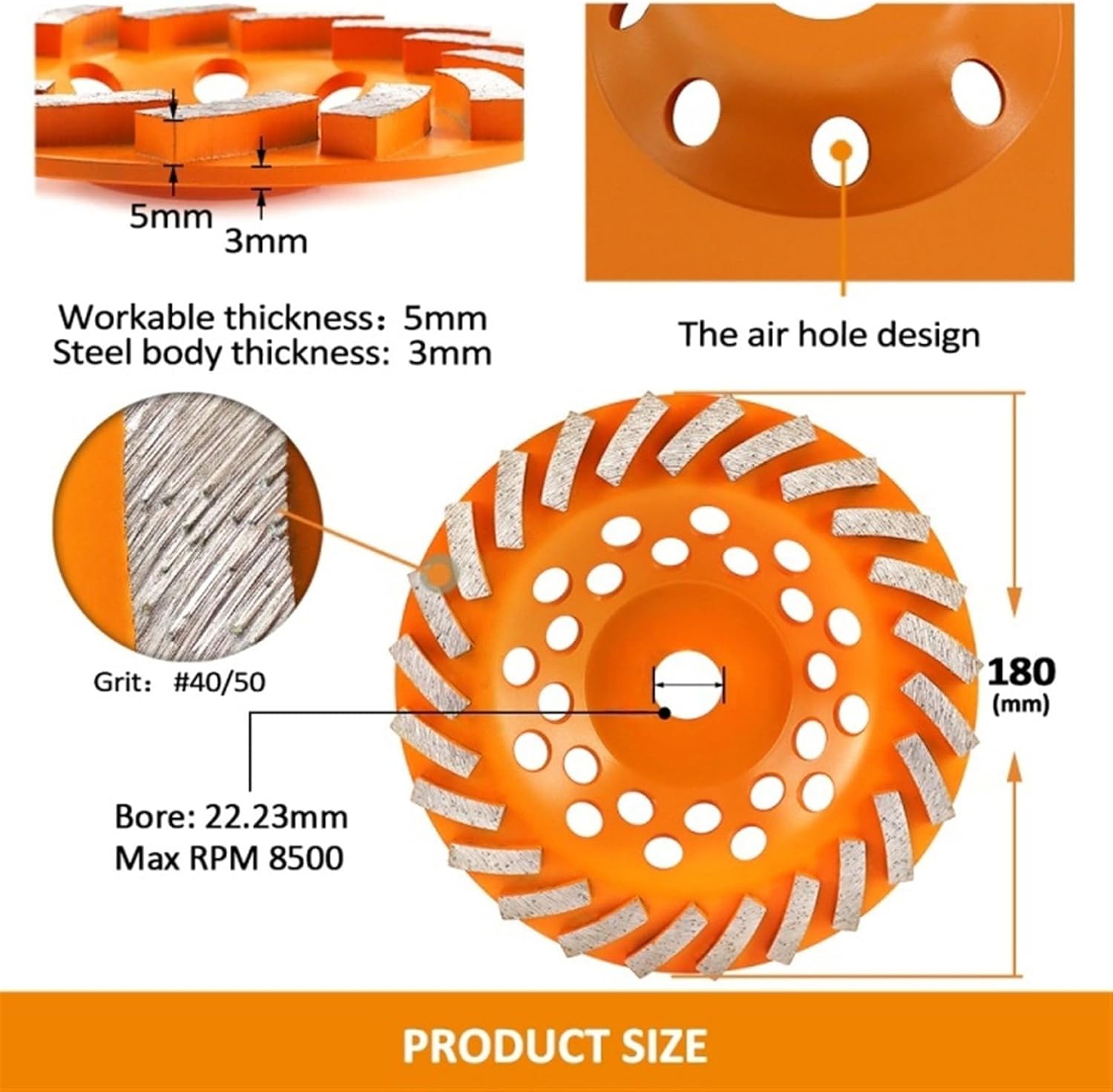 Application:Suitable for grinding marble,granite,concrete,brick,masonry,etc...Feature:1)5mm thickness diamond coated segment,strong steel base,longer endurance.2) Turbo row segment design,compact arrangement,better finish quality.3)Air hole design helps heat dissipation and scrapsdischarge,higher efficiency.4)Dynamic balance test,grinding evenly,no shaking.