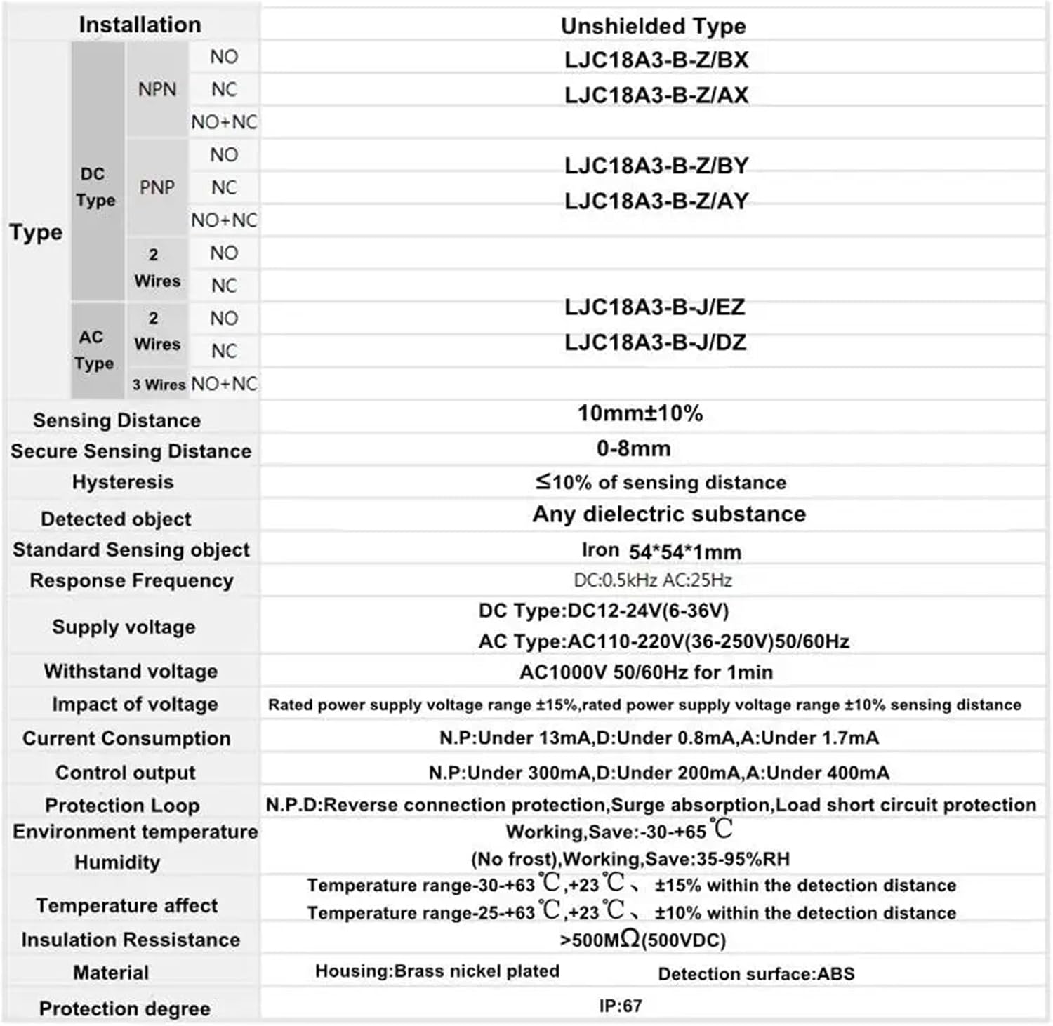SwitchesCapacitive Proximity Sensor Switch LJC18A3-B-J/EZ/DZ 2 Wires 220V NO/NCOutput:LJC18A3-B-J/DZ:Normal CloseWorking voltage:AC110-220VDiameter:18mmDetection distance:10mm±10%Detection objects:Metal and non-metallic plastic, glass, water, oil, feed etcEach bid for 1pcs.==========Hign-concerned Chemical : NoneMaterial : PlasticCertification : NoneSwitch Type : Proximity SwitchModel Number : DefaultItem Type : SWITCHESIs Smart Device : Notype : LJC18A3-B-J/DZ