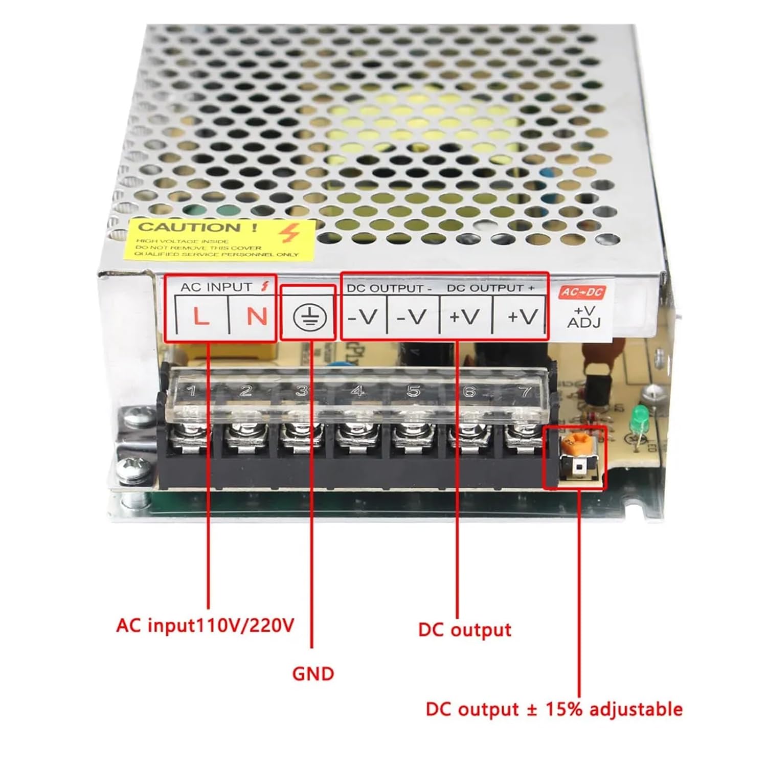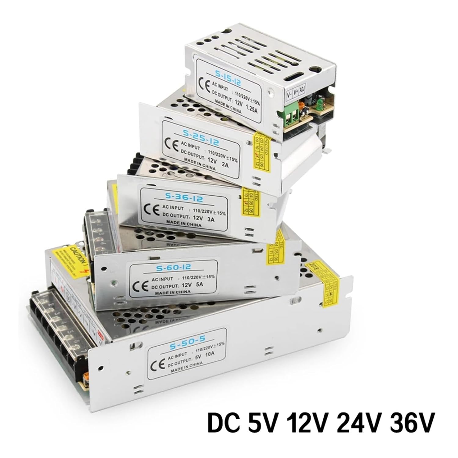 Power SuppliesProduct DescriptionInput voltage: AC110V/240VOutput voltage: DC 5V/DC12V/DC24V/DC36VOutput current: 0~60AShell material: metal shell/aluminum shellSafety compliance: CCC/Rohs/CECost-effective, industry-standard reliabilityBuilt-in overvoltage, overcurrent, short circuit protectionWorking temperature: 0~40℃Storage temperature: -20~60℃Environmental humidity: 0~95%, no condensationFor indoor use only!Package Included:1 power supplyType (output)Dimensions (length x width x height)Input voltage (AC)12V 1A 12W70mm*40mm*30mm85V-265V12V 2A 24W85mm*57mm*33mm85V-265V12V 3A 36W85mm*58mm*38mm85V-265V12V 5A 60W110mm*78mm*36mm85V-265V12V 8A 96W160mm*98mm*42mm85V-265V12V 10A 120W162mm*98mm*44mm85V-265V12V 12.5A 150W198mm*98mm*43mm85V-265V12V 15A 180W198mm*98mm*43mm85V-265V12V 20A 240W200mm*100mm*44mm110V/220V+/-15%12V 30A 360W200mm*100mm*45mm110V/220V+/-15%12V 40A 480W215mm*115mm*50mm110V/220V+/-15%12V 50A 600W242mm*124mm*65mm110V/220V+/-15%12V 60A 720W245mm*125mm*68mm110V/220V+/-15%24V 1A 24W85mm*57mm*33mm85V-265V24V 2A 50W110mm*78mm*35mm85V-265V24V 3A 72W110mm*78mm*35mm85V-265V24V 5A 120W158mm*98mm*40mm85V-265V24V 10A 240W198mm*98mm*40mm85V-265V24V 15A 360W198mm*110mm*50mm110V/220V+/-15%24V 20A 480W198mm*110mm*50mm110V/220V+/-15%24V 25A 600W215mm*115mm*50mm110V/220V+/-15%24V 30A 720W215mm*115mm*50mm110V/220V+/-15%24V 33A 792W242mm*124mm*65mm110V/220V+/-15%5V 2A 10W70mm*40mm*30mm85V-265V5V 6A 40W85mm*57mm*33mm85V-265V5V 10A 50W110mm*78mm*36mm85V-265V5V 20A 50W160mm*98mm*42mm85V-265V