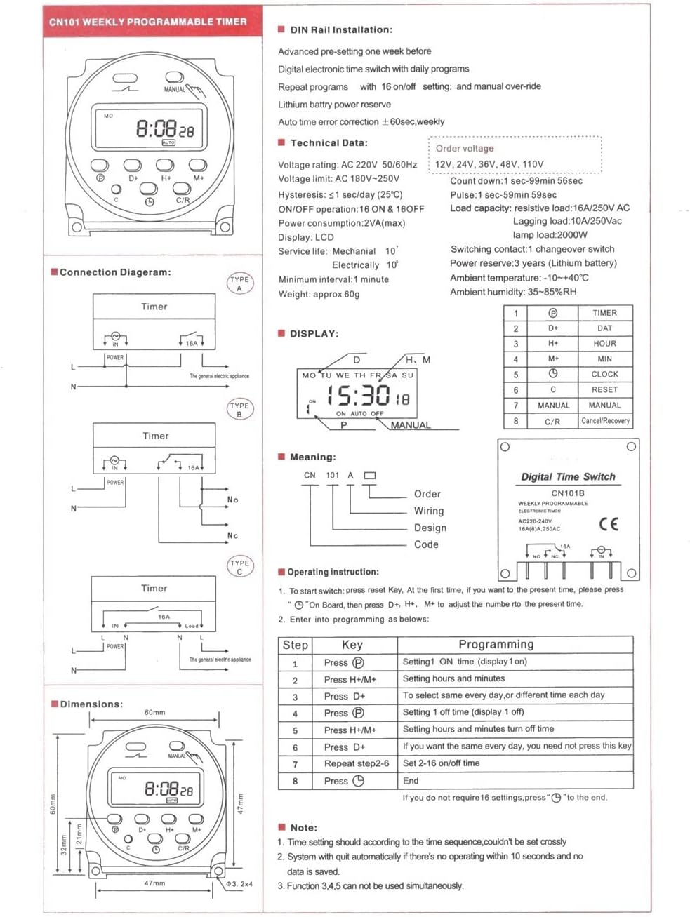 SwitchesTechnical DataOperation Temperature: -20~+55Operation Voltage: 220~240VAC 50~60HzPower Consumpiton: <;1wControlled Power: 16(8)250VACIndicator Operating: LCDCycle Range: 1min~168hoursTolarance: 1s/24h 25Set Up Times: 16times(day/week) 16on/16off15 combinations to a week.Dimension:60*60*32mmDuring Operation,no water,no oil,no corruption