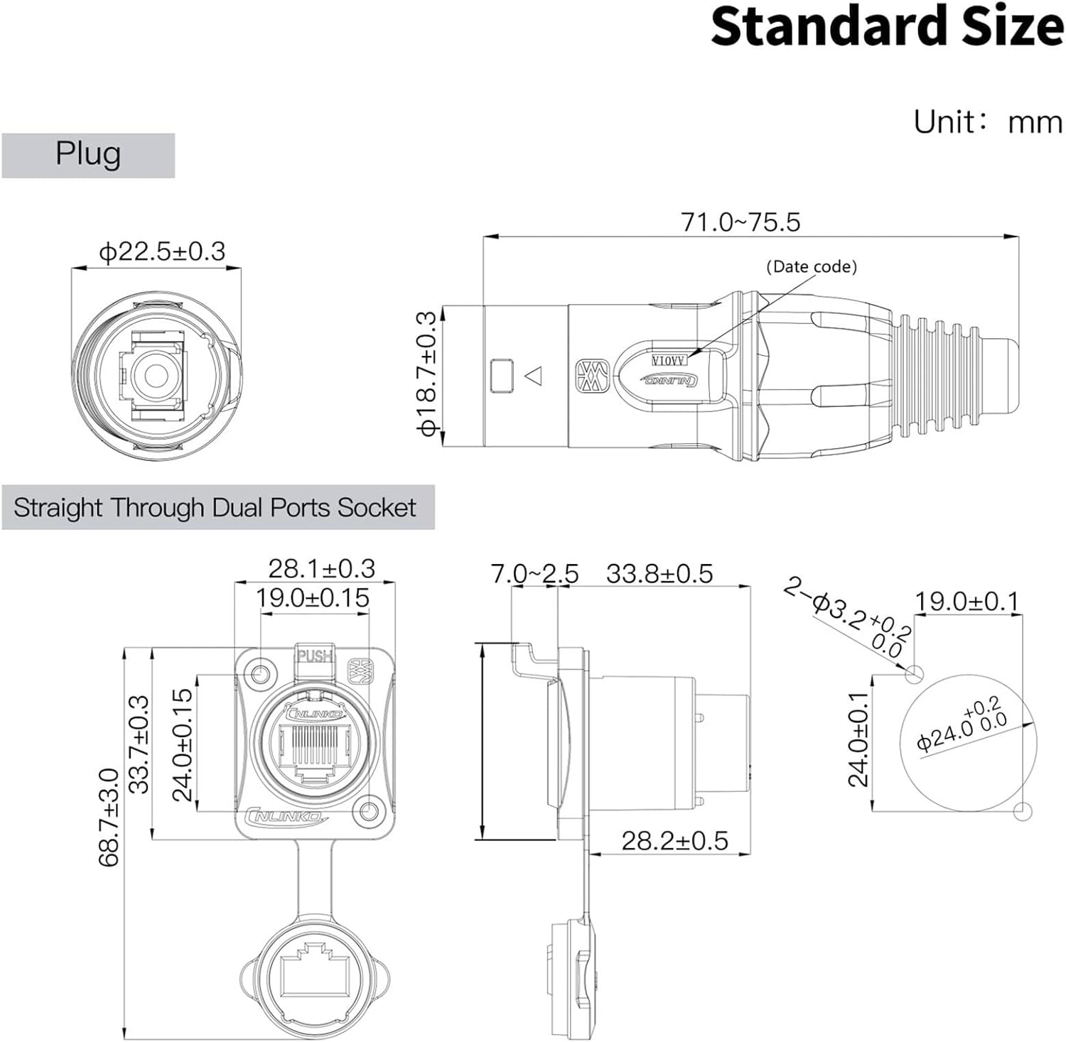 Electrical ConnectorUL/TUV 8 pin Outdoor RJ45 cable ethernet socket connector weatherproof IP65 jack signal connectorFeatures:Weatherproof IP65 RatingThe RJ45 connector boasts a robust weatherproof IP65 rating, ensuring reliable performance in harsh outdoor conditions.Outdoor CompatibilityDesigned specifically for outdoor use, this connector withstands the elements, ensuring stable connectivity in any weather.UL/TUV Certified QualityThis connector has been certified by both UL and TUV, guaranteeing its superior quality and safety standards.8 Pin Ethernet SocketWith an 8 pin Ethernet socket, this connector offers high-speed data transmission for efficient networking.==========Model Number : YT-RJ45Cable specification : 0.25~0.12mm²/23 ~26AWGDiameter range : Tolerance 5.0mm~6.8mmContact diameter *number : 8pinInsulation resistance(Min.) : 500 m omegaContact resistance(Max.) : 30 m omegaCurrent rating : 1.5AProtection Class : IP65Working temperature : -40 degrees Celsius~85 degrees CelsiusConnecting mode : plug/ unplug