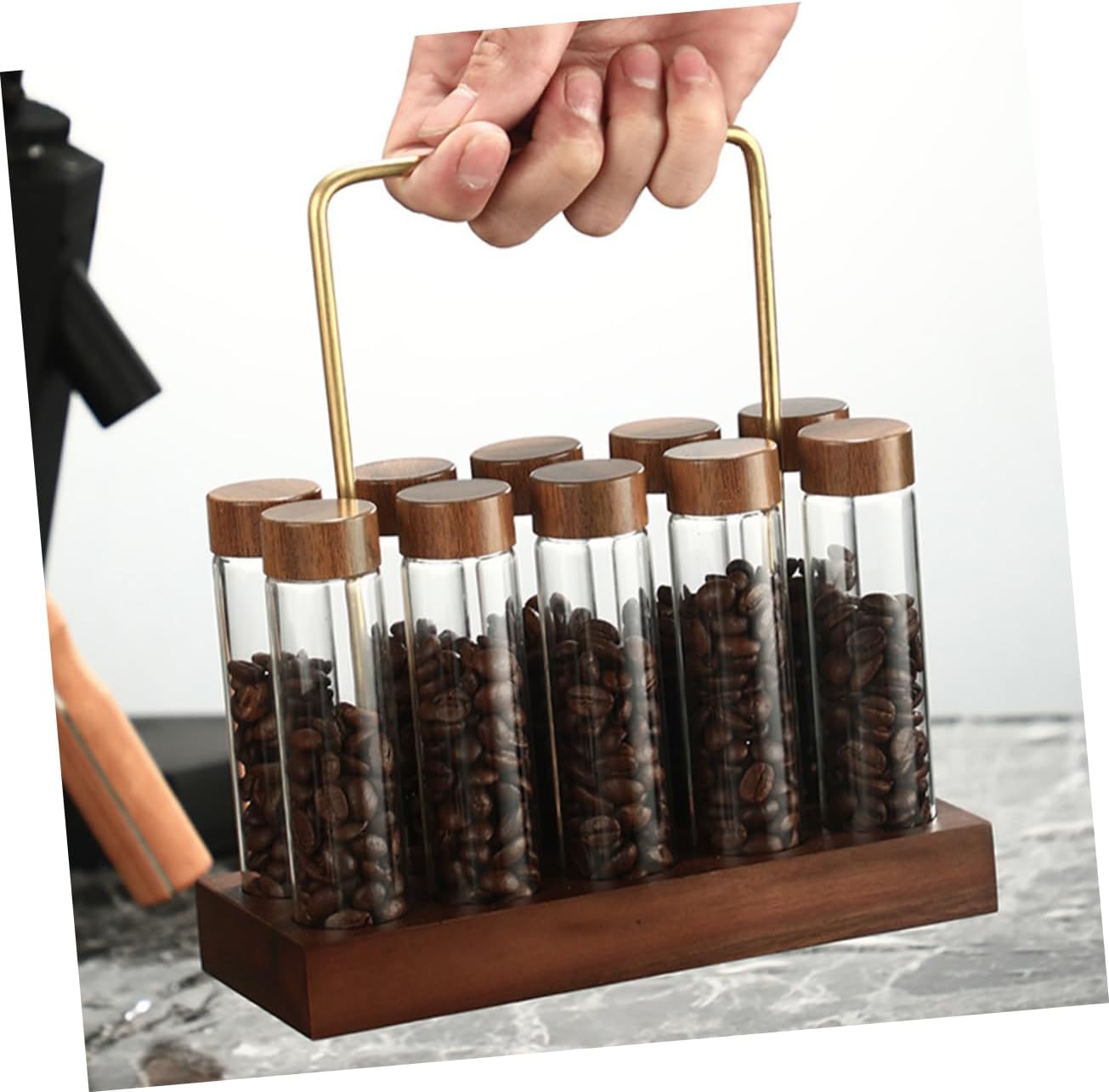 Package Include 1 x Base 10 Tubes Characteristics -Material:Glass, wood and brass coffee storage tube -Size:21.50X18.80X8.80cm/8.45X7.39X3.46in glass coffee bean vials with lids -Color:Dark Red glass sealed jar - Safe and convenient to use, not easy to break or deform, reusable and can be applied for a longtime glass tubes with wood stand. - These glass tubes can be widely used for holding coffee beans, tea, candy, candies, honey, and other kitchen seasoning clear coffee bean storage tube. - The wooden display stand can be a practical storage or display stand for these glass coffee beans storage tubes coffee bean storage tubes. - sealing performance, with a transparent design, which is easy to distinguish the food coffee storage jars. - Sealed jar can prevent your dry food from dirt, suitable for home, restaurant kitchen use glass coffee containers.Goods Descriptionsealed airtight coffee bean canisters This is a set of mini coffee beans display rack and glass tubes, this multifunctional glass storage tube is suitable for storing and preserving a variety of ingredients including coffee beans preserves, jams, chutneys, rice, sugar, flour, tea, coffee, spices, biscuits, which is multipurpose and practical