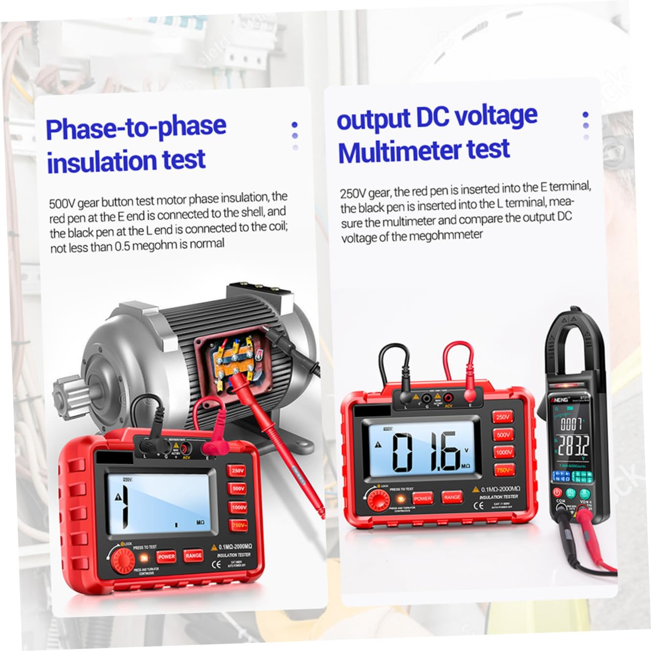 Package Include 1 x Digital Megohmmeter 2 Cables 2 x Clamps 1 x Manual 1 x Packing Box Features - Range insulation resistance: : 0.1 MΩ ~ 20MΩ, 500V : 0.1 MΩ ~ 50MΩ, 1000V : 0.1MΩ ~ 100MΩ; : 20MΩ~500MΩ, 500V: 5OMΩ~1000MΩ, 1000V: 100MΩ~2000MΩ Backlight Megohm Meter. - Short circuit : <1.6MA LCD Display Megohmmeter - Battery: 8 x AA battery (not included) LCD. - Size: 16.50X12.00X5.70cm/6.48X4.72X2.24 inch Digital Insulation Resistance Tester. - Output : /500V/1000V LCD Megohm Meter. - Material: ABS, rubber, brass Digital. - Maximum display: 1999 counts Backlight Resistance Tester. - Median resistance: /500V: 2MΩ, 1000V: 5MΩ Meter. - Test : (R=250KΩ), 500V (R=500KΩ), 1000V (R=1MΩ). - measurement: 750V. - The design, manufacture and testing of this instrument all meet safety requirements for electronic measurement products, with a variety of levels output, large capacity, strong anti-interference Insulation Tester. Specification Digital Megohmmeter - The ease of operation and safety are significantly better than traditional mechanical shaker is a perfect test instrument for measure the insulation resistance of generator, high- motor, power capacitor, power cable and arrester Electronic Megohmmeter.Goods InformationMeter That's because our product can meet your need.LCD It is not easy to get deformed and bring you much convenience.Digital Megohmmeter If you are looking for a professional and digital insulation tester, then your research is over here.LCD Insulation Resistance Tester Adopted of , it is practical and for long time use