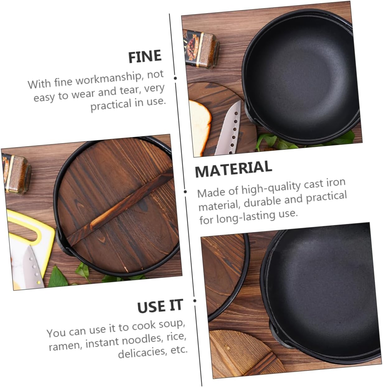 Package Include 1 x pot 1 x wooden cover 1 x storage bag Characteristics -Color:Assorted Color Soup Pot -Material:cast iron Stockpot -Size:27.00X27.00X9.30cm Non-stick Pot -Adoption of , sturdy and for long-term use Hot Pot. -It has a simple design, but very in use Outdoor Saucepan. -Perfect for backpacking, camping, outdoor cooking, family gathering, picnic, etc Outdoor Cookware. -Health and safety, non stick, more convenient to clean Soup Pot. -Lightweight and portable, easy and convenient to carry and use Stewpan.Goods DescriptionCamping Cooker Pot Suitable for camping, backpacking, picnic, hiking, and other outdoor activities. Stockpot Easy to store and use and outdoor.Cooking Boiler This item is a hanging cooking pot, adoption of premium cast iron material for and to use