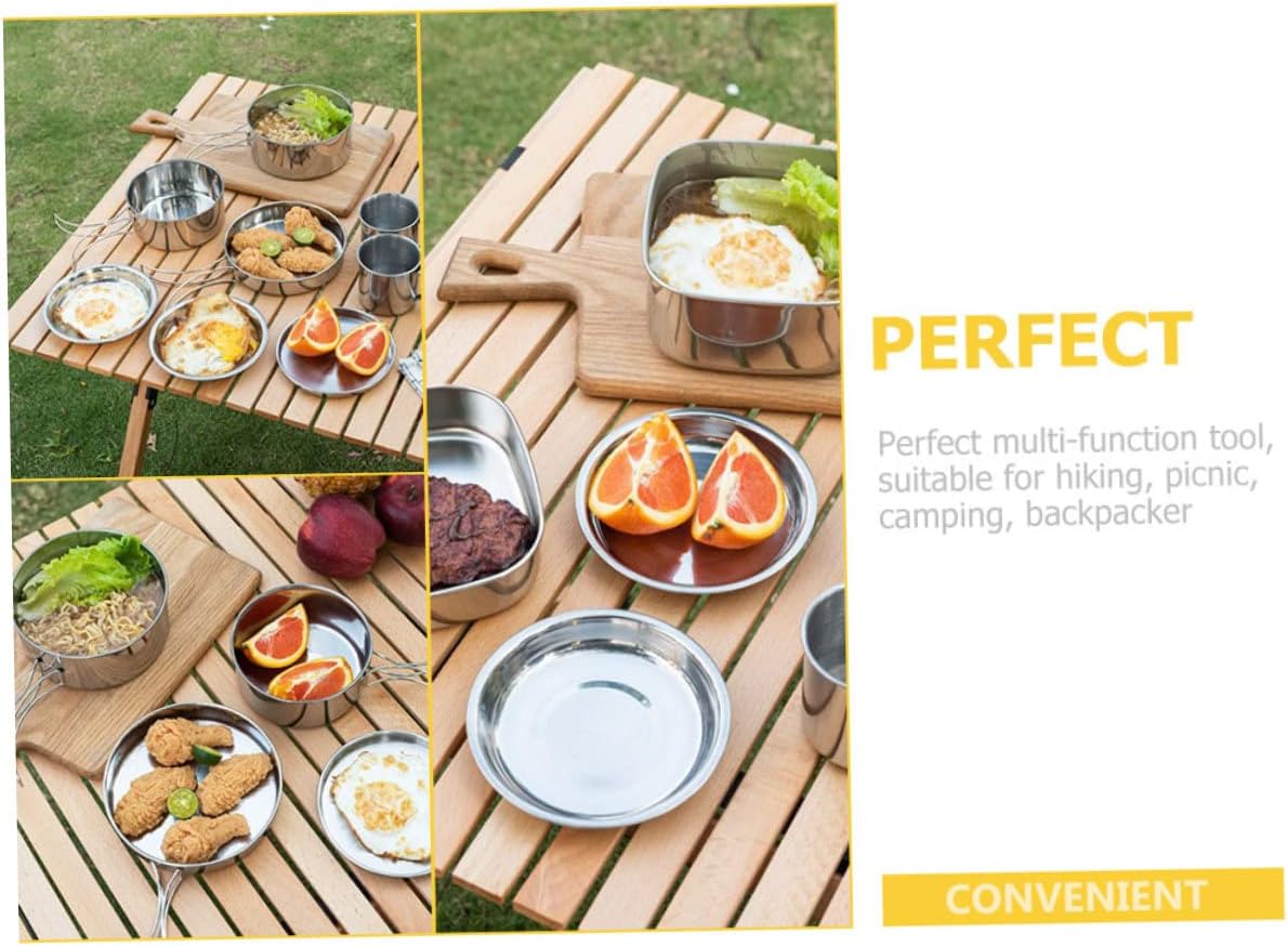 Package List 1 × Stew Pot 1 × Frying Pan 2 × Plates 2 × Cups Features -Size:15.20X15.20X4.00cm/5.97X5.97X1.57in (Frying Pan) outdoor camping cookware -Color:Silver camping cookware outdoor -Size:13.70X13.70X2.00cm/5.38X5.38X0.79in (Plate) camping cooking gear -Material:Stainless steel camping pot -Size:14.20X14.20X7.00cm/5.58X5.58X2.75in (Skillet) stainless steel camping cook pot -Size:7.50X7.50X7.00cm/2.95X2.95X2.75in (Cup) camping cookware kit -The stainless steel cookware kit contains stew pot, frying pan, plates, and cups, multipurpose to use camp cooking utensils. -The pot and frying pan are designed with foldable handles, convenient to fold for easy storage camping cooking utensils. -These portable stainless steel cookware kit is perfect for outdoor camping, hiking, fishing, and so on camping cooking tool. -Made of premium stainless steel material, these cookwares are not easy to break or deform, can be used for a long time outdoor cooking supplies. -They are small and compact, light and portable, easy to carry and convenient to store, suitable for camping camping stainless steel cookware.Goods Descriptioncamp cooking utensils want to have some camping cookware? Then, our camping cookware is carefully prepared for you.camping cooking pot A complete and durable cookware for camping, hiking, backpacking, picnic, day trips, family parties, lightweight and portable