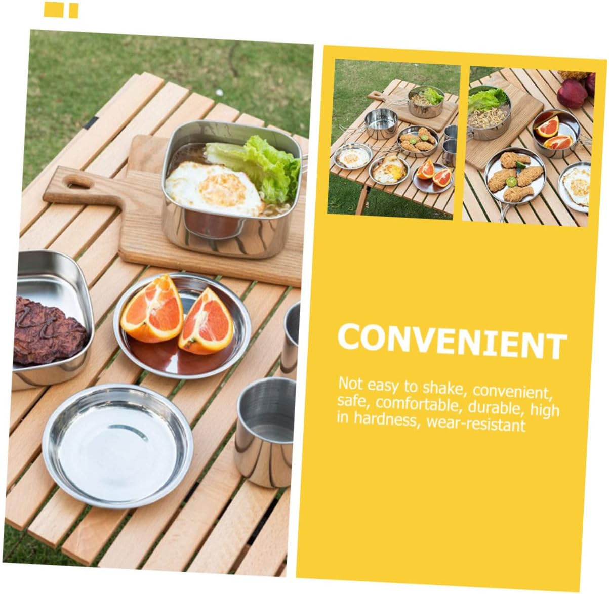 Package Include 1 × Stew Pot 1 × Frying Pan 2 × Plates 2 × Cups Characteristics -Size:15.20X15.20X4.00cm/5.97X5.97X1.57in (Frying Pan) outdoor picnic supplies -Material:Stainless steel lightweight pan pot -Size:7.50X7.50X7.00cm/2.95X2.95X2.75in (Cup) camping accessories -Size:14.20X14.20X7.00cm/5.58X5.58X2.75in (Skillet) camping cookware -Color:Silver picnic supplies -Size:13.70X13.70X2.00cm/5.38X5.38X0.79in (Plate) portable cook combinations -These portable stainless steel cookware kit is for outdoor camping, hiking, fishing, and so on hiking cooking tool. -Made of stainless steel material, these cookwares are not easy to break or deform, can be used for a long time camping cookware. -They are small and compact, light and portable, easy to carry and convenient to store, suitable for camping stainless steel camping pot. -The pot and frying pan are designed with foldable handles, convenient to fold for easy storage portable cooking kit. -The stainless steel cookware kit contains stew pot, frying pan, plates, and cups, multipurpose to use camping pot.Goods Description camping cookware Do you want to have some camping cookware? Then, our camping cookware is carefully prepared for you.travel picnic cookware A complete and cookware for camping, hiking, backpacking, picnic, day trips, family parties, lightweight and portable