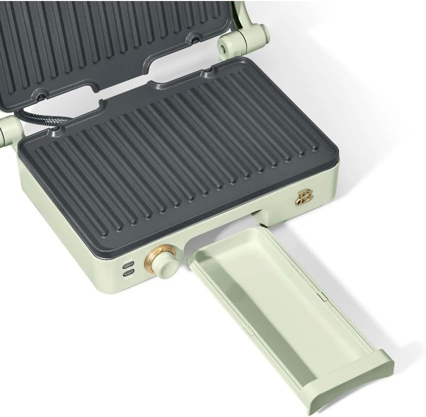 Transform your kitchen countertop into a versatile cooking station with this elegant 2-in-1 Panini Press and Indoor Grill in sophisticated sage green with luxurious gold accents. The non-stick griddle plates feature perfect grill lines for creating restaurant-quality sandwiches, meats, and vegetables. This sleek appliance opens 180 degrees to double your cooking surface, making it ideal for preparing multiple dishes at once. The adjustable temperature control dial ensures precise heating for different foods, while the removable drip tray makes cleanup a breeze. The floating hinge design accommodates foods of various thicknesses, from delicate sandwiches to thick-cut proteins. Its compact size and beautiful design make it a practical yet stylish addition to any kitchen, while the durable construction promises long-lasting performance. Whether you're craving perfectly pressed paninis or grilled classics, this versatile appliance delivers professional results in the comfort of your home.