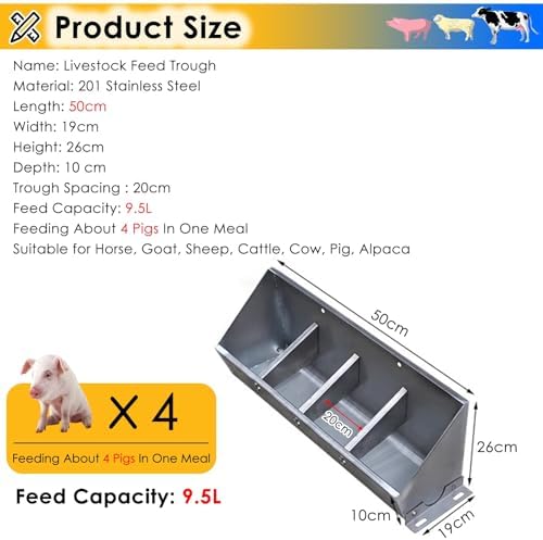 Introducing our Livestock Feeding Trough, designed to address common challenges faced during animal breeding. Are you tired of feed wastage and soaring breeding costs? Struggling with competition among livestock for feed? Is cleaning up after feeding a tedious task? Our innovative feeder is here to streamline your feeding process, allowing you to conserve resources and simplify your daily routine. **Specifications:** - **Material:** 201 Stainless Steel - **Sizes Available:** 50cm, 100cm, 150cm, 200cm - **Dimensions:** Width: 19cm, Height: 26cm, Depth: 10cm - **Feed Capacity:** 9.5 L, 19 L, 29 L, 38 L - **Feeding Capability:** Up to 10 small pigs per meal - **Suitable for:** Horses, Goats, Sheep, Cattle, Pigs **Key Features:** Our stainless steel feeder boasts a smooth, easy-to-clean surface compared to traditional options. It accommodates various animals, including horses, goats, and pigs, making it a versatile choice for your farm. The partitioned design enhances feeding dynamics, ensuring orderliness and minimizing mess during feeding times. Built with a sturdy angle iron installation, this trough can withstand the weight and pressure of larger animals, making it both durable and reliable. The customizable drainage port allows for dual use as both a food and water feeder, perfect for a variety of settings. This feeder is ideal for both personal and commercial use, providing a hygienic solution for large-scale animal husbandry. The thoughtful design features a front-low, rear-high structure, enabling animals to eat comfortably without spilling feed. Every unit comes with the necessary components for simple installation, whether you choose to hang or bolt it down. It's not just a practical addition to your farm; it also makes for a thoughtful gift for farmers or livestock enthusiasts. What will you receive? 1 × Livestock Feeding Trough. Optimize your feeding experience and enhance your livestock management today!