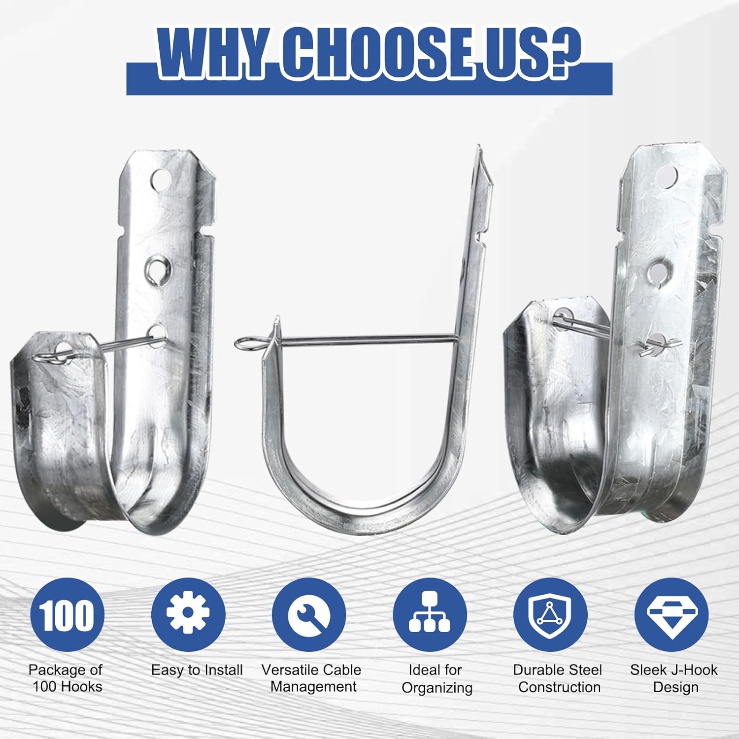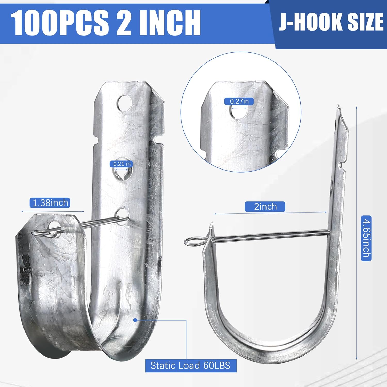 Features: These 2" Cable Support J Hooks are made from high-quality galvanized steel, ensuring resistance to rusting and corrosion. The sturdy construction guarantees reliable performance in various environments. Each J Hook comes with a retainer clip, allowing for quick and secure installation on cables, wires, or ropes. The retainer clip ensures the hook stays in place, providing stable support for your items. Specifications: Material: galvanized steel Color: silver Size: 1.38*2*4.65inch Package includes: 100 x cable support J-hooks Notes: Manual measurement, please allow slight errors on size. The color may exist a slight difference due to different screen displays.