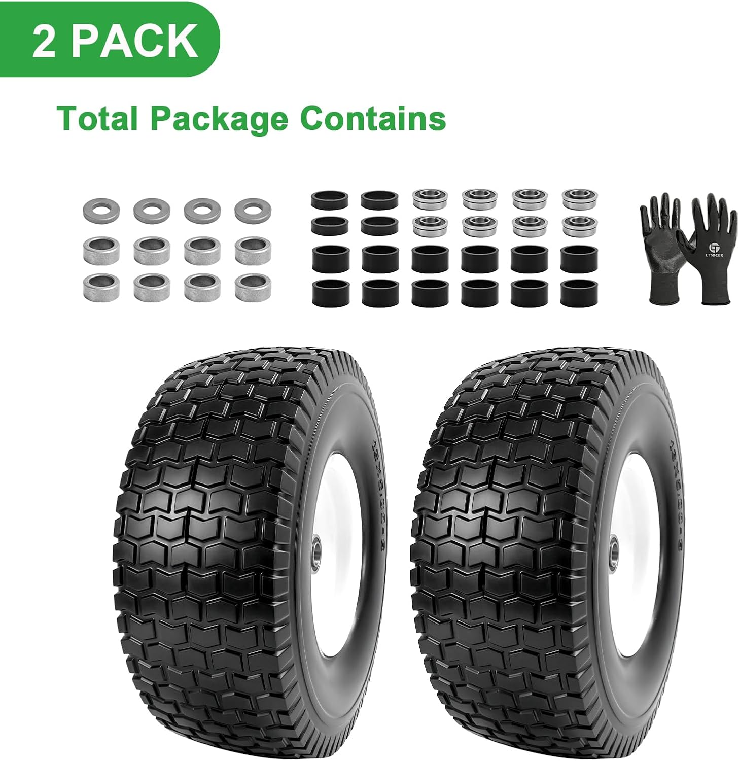 Specs : Tire Diameter: 15" Tire Width: 6" Rim Diameter: 6" Bore ID: 3/4" Hub offset: 3 Package Includes: 2 x 15x6.00-6" "LAWN MOWER TIRE Applicable Models 15x6.00-6" Tubeless Front Tire for golf carts, utility vehicles, and riding lawn mowers (Not for highway use)