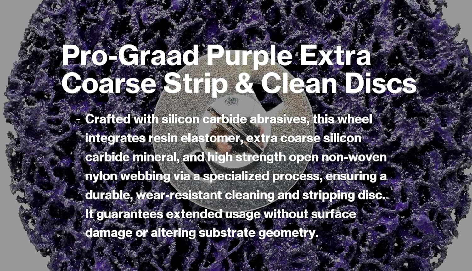 Pro-Graad Strip & Clean Discs are manufactured with high strength non-woven open webbing, resin elastomer, and extra coarse silicon carbide mineral. Its specialized integration with high-strength open non-woven nylon webbing ensures durability and wear-resistance, guaranteeing extended usage without causing damage or altering substrate geometry. Designed with a robust mesh honeycomb pattern, this disc excels in dissipating heat swiftly, significantly extending its lifespan. The non-woven nylon webbing prevents clogging during operation, maintaining consistent and reliable performance. Versatility defines its application range, effectively eliminating rust, dirt, paint, weld spatter, scaling, oxidation, and more from diverse surfaces. It's the ideal choice for tasks requiring rapid and efficient surface cleaning or preparation. For safety, adhere to recommended speeds to maximize the disc's service life. Its high-quality construction ensures thorough paint and rust removal without compromising the original surface. Prioritize safety by complying with ANSI B7.1 safety standards and using appropriate protective gear to mitigate injury risks.