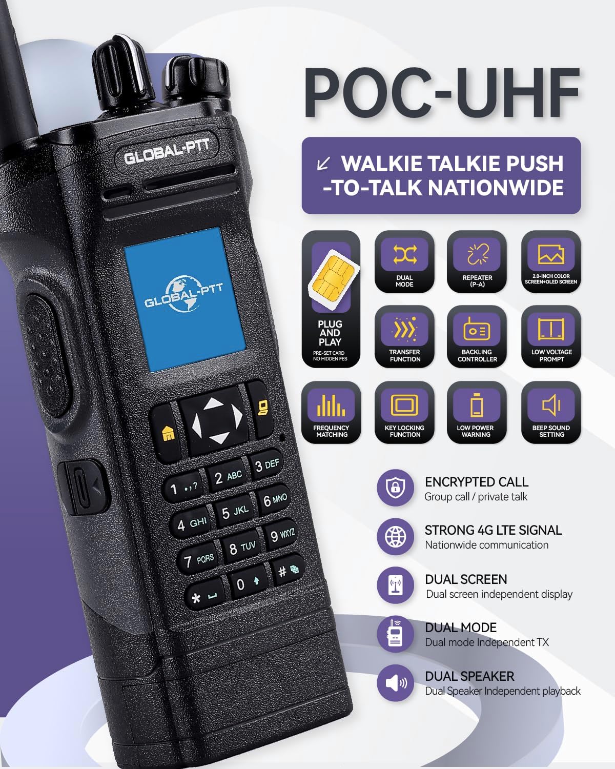 Experience the next generation of communication with GLOBAL-PTT Dual-Mode PoC + UHF Analog Radios โ combining modern nationwide connectivity with the reliability of classic analog. This 2-pack of radios delivers instant push-to-talk communication anywhere your team operates โ whether in the same building or across the country. Each radio includes a pre-installed 4G LTE SIM card for global PTT service and supports analog UHF frequencies (400-520 MHz) for traditional local use. The dual-screen display, 10W high power, and Type-C fast charging make it ideal for business fleets, logistics teams, security patrols, ranch workers, and adventurers who need reliable voice communication at all times.