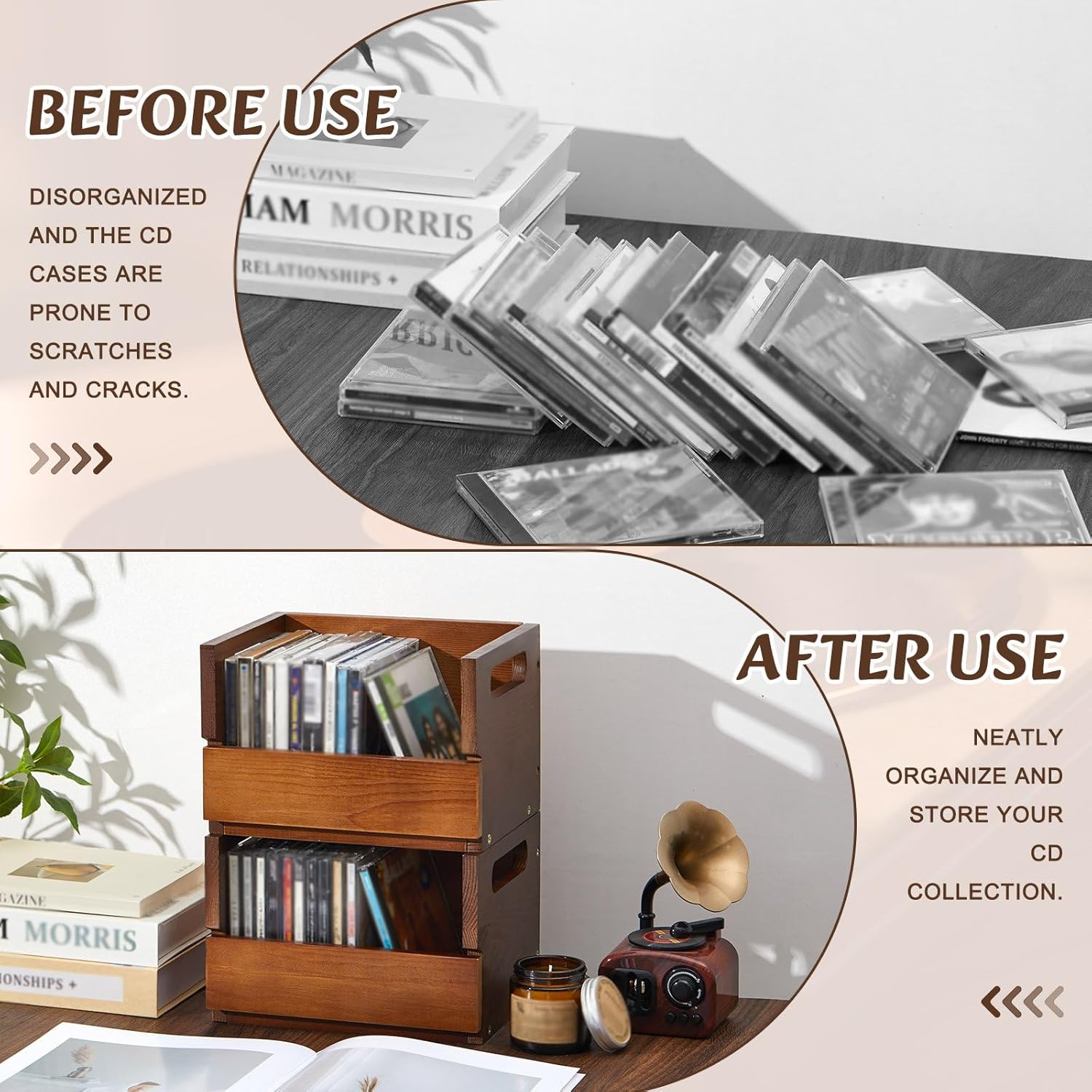 Features: The front cover is held place by a powerful magnet. All you have to do is pull it down for easy access to your media. They are stackable, sturdy, good stability, and good protection for CDs. Specifications: Material: wooden Color: brown Size: about 8.7 x 6.9 x 5.9 inches Package includes: 2 x Small CD storage Box Notes: Manual measurement, please allow slight errors on size. The color may exist a slight difference due to different screen displays