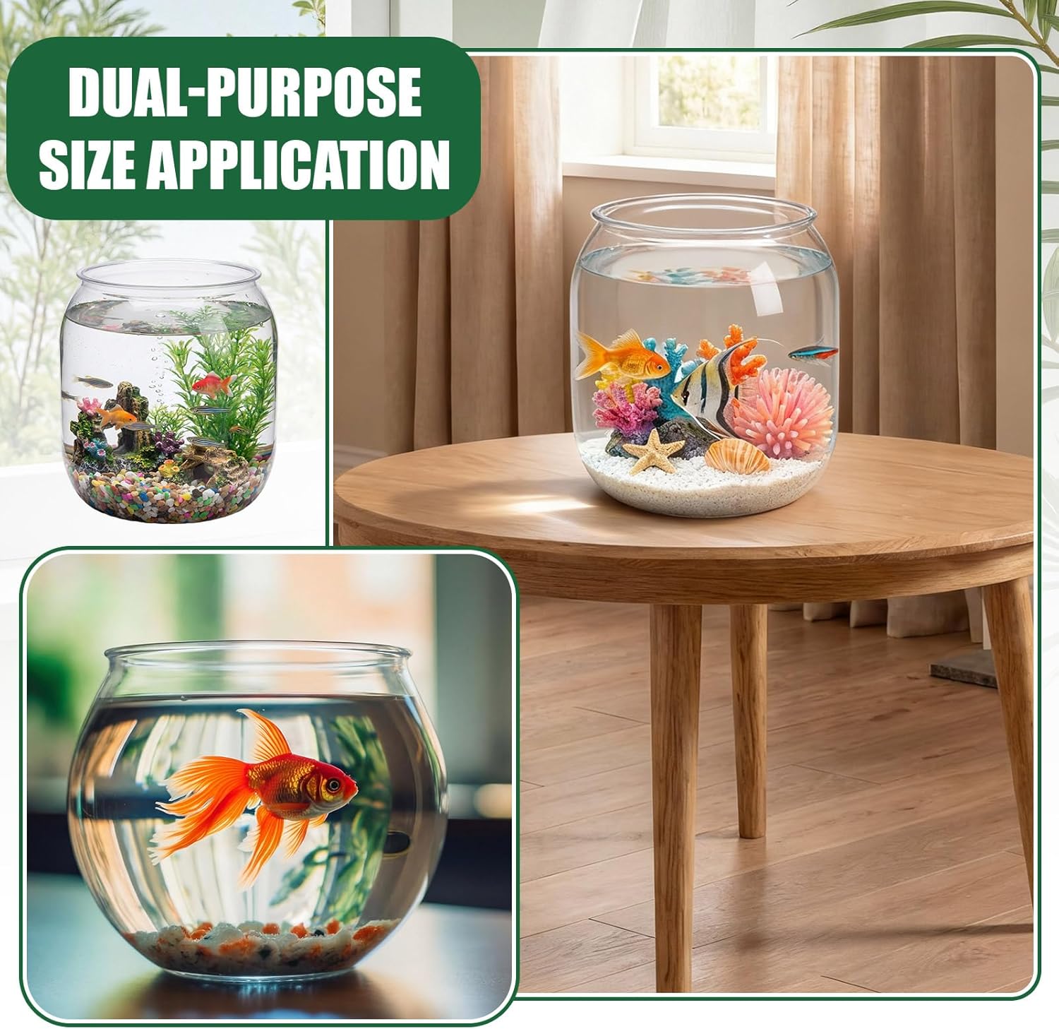 Features: These round fish tank containers serve both functional aquatic habitats and decorative purposes for gifts, home decor, or office enhancements. Both plastic fish tanks feature compact round bases that fit easily on desks, shelves, and countertops. The 8.9-inch and 6.3-inch openings allow convenient access for maintenance and feeding. Specifications: Material: plastic Color: clear Size: Large: about 8.9 inch opening, 10.6 inch at maximum diameter, 11.4 inch total height Small: about 6.3 inch opening, 7.87 inch at maximum diameter, 6.7 inch total height Package includes: 2 x Plastic fish tank Notes: Manual measurement, please allow slight errors on size. The color may exist a slight difference due to different screen displays Small items are included, please keep them away from pets in case of choking risk. Before purchase, confirm whether the product size is suitable for your pet, and observe the pet's reaction when using. Please remove the product in time if there is any discomfort