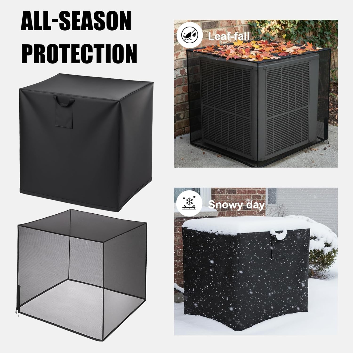 Features: The combination of a waterproof and windproof air condenser cover and a mesh AC cover provides complete protection for your AC unit year round The covers safeguard your AC unit against rust, corrosion, and other types of damage caused by moisture and environmental factors, significantly keep your ac unit in good condition by stopping debris like leaves, branches, weeds and cotton from entering the outside AC unit Specifications: Material: polyester, oxford Color: black Size: about 32 x 32 x 36 inches, 34 x 34 x 30 inches Package includes: 1 x Winter air conditioner covers 1 x Full mesh ac covers for outside Notes: Manual measurement, please allow slight errors on size. The color may exist a slight difference due to different screen displays