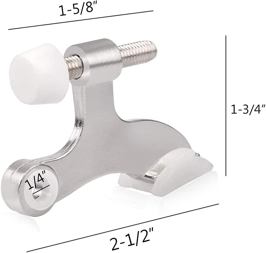 Specification: Material: Zinc alloy and rubber Color: Nickel color Size: 2.5" x 1.75" Qty: 2 pcs Features: Door stop is made of heavy-duty zinc alloy and high-quality rubber No tools required, just take out the hinge of the door and install the door stop Rubber bumper tip protects door from impact in addition to avoiding wall and door damage Note: Due to the light and screen setting difference, the item's color may be slightly different from the pictures. Please allow slight dimension difference due to different manual measurement.