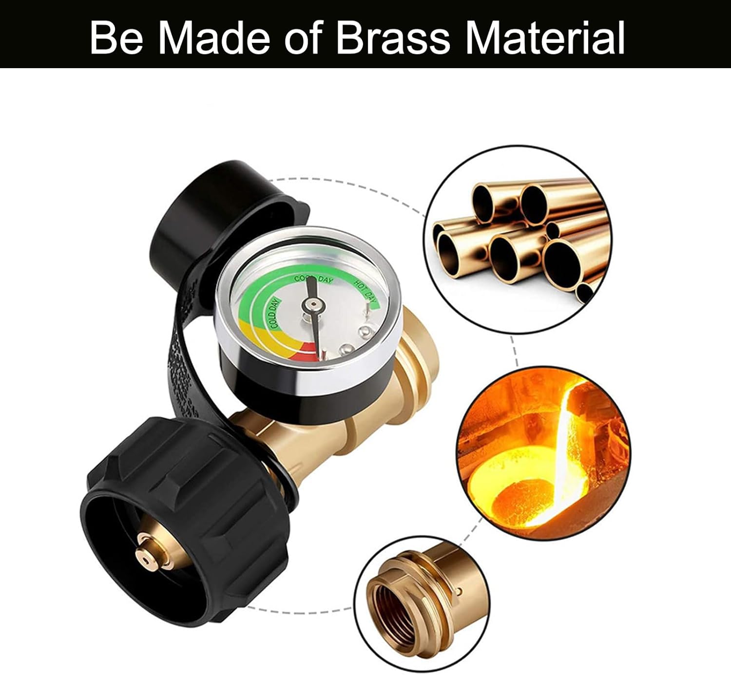 Feature:【Solid And Sturdy】Propane gauge is made of brass with solid construction that can withstands weather, scratching, denting and corroding, even in the humid environment will not affect the use. 【3 Color Coded Dial】Featuring a large color-coded dial, which allows you to see when the tank propane level. The needle in the green zone means there is plenty of gas, yellow means there is not enough gas, and red means the gas is almost depleted, allowing you to see at a glance when your propane level is low.you'll never have to worry about leaks or running out of propane again.【Strong Sealing】This propane tank gauge is well made with clear and accurate non-chipped threads, allowing it to be tightly secured to the propane tank. The propane tank gauge provides an airtight connection that can effectively prevent propane tank gas from leaking to causing accidents, which is safe and reliable.【Easy To Use】Simply hand-tighten for quick installation without the need for any additional tools. The handwheel design makes propane cylinder gauge can be installed with appliances with a QCC1 connection and propane tanks within a few minutes.【Wide Application】This propane tank gas gauge can be worked with propane tank cylinders, propane regulator with hose and propane adapter. Great for using gas grill, heater, smoker, camp stove, lantern, tabletop grill, fire pit table, turkey fryer and more propane appliances.Specifications:Name: Propane GaugeMaterial: Brass, PlasticSize: As ShownConnection Type: QCC1 Hose and RegulatorPackage Included:1/2 * Propane Gauge