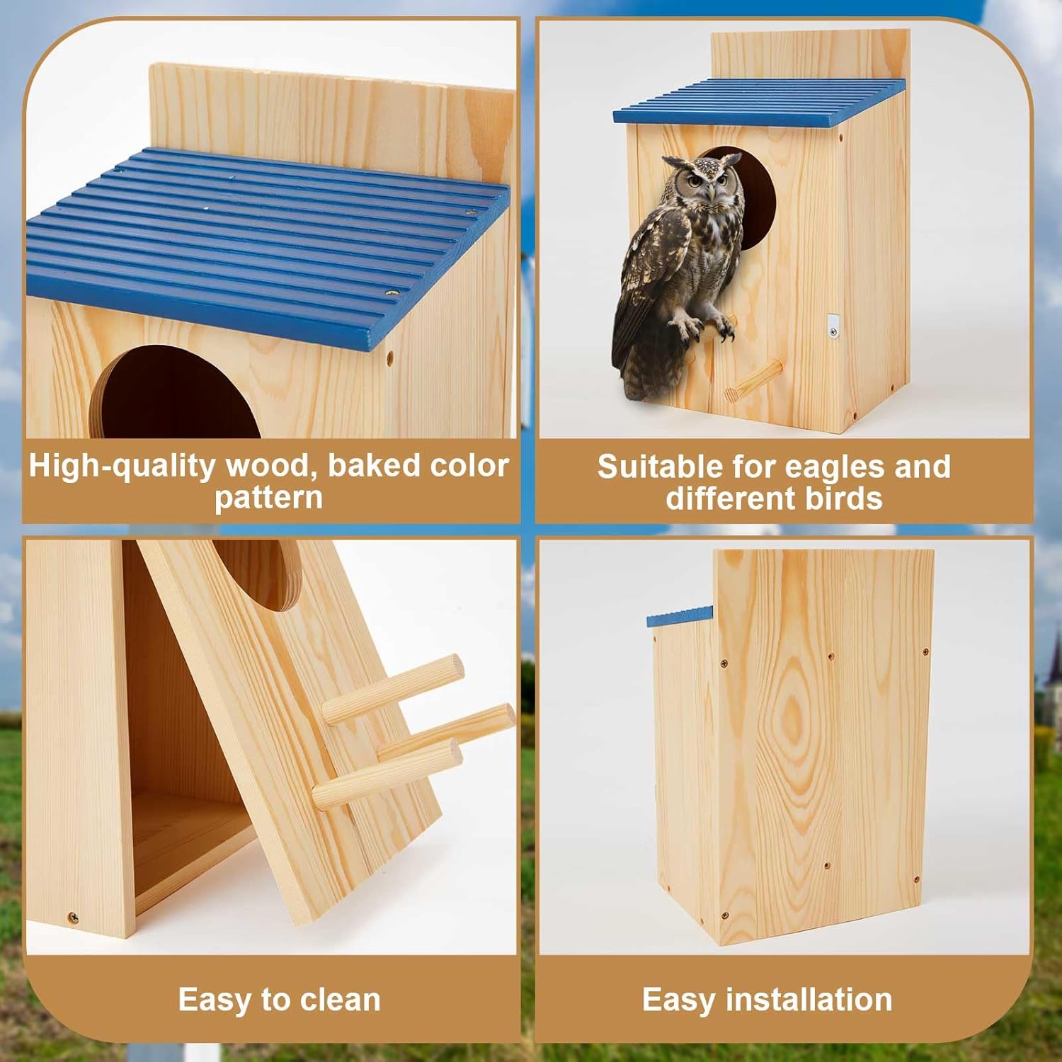 Features: This owl box is long-lasting, and able to withstand the wear and tear of outdoor use. This means that it will last for many years to come, providing your owls with a comfortable home for a long time. Our owl house wooden building made for owls, suitable for owls, saw-whet owls, kestrels, but it can also accommodate a variety of other bird species, providing them with a total of a comfortable perch in the outdoors Specifications: Material: wooden Color: as pictures shown Size: 9 x 7.5 x 14.5 inches (LxWxH) Package includes: 2 x Screech Owl House Notes: Manual measurement, please allow slight errors on size. The color may exist a slight difference due to different screen displays.