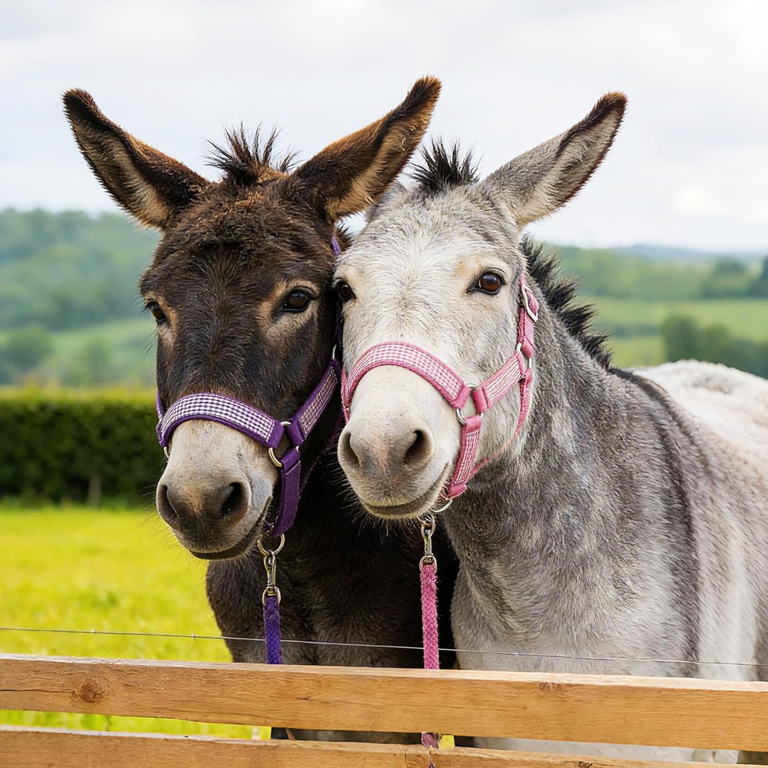 Features: Comfort-focused contoured padding Key contact areas feature fitted padding to evenly distribute pressure. This design minimizes friction on sensitive areas such as the neck and bridge of the nose, thereby improving the mini donkey's cooperation during training. Versatile for training and daily care: This miniature donkey bridle leash is suitable for leading, grooming, veterinary checkups, or herding. Its lightweight yet sturdy construction ensures maneuverability without restricting the miniature donkey's natural movement, fostering positive interaction between owner and donkey. Specifications: Material: nylon, nickel-plated hardware Color: purple, pink Size: small Package includes: 2 x Mini donkey harness 2 x Leashes Notes: Manual measurement, please allow slight errors on size. The color may exist a slight difference due to different screen displays