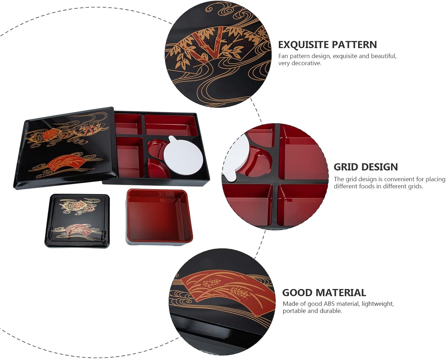 Package List 2 x Sets of Bento Boxes Features -Color: Black -Size of sushi box: About 31.00X24.80X5.00cm/12.18X9.75X1.97in -Product Info:Sushi Bento Box -Material: ABS -Size of eel box: About 15.40x13.00X7.00cm/6.06X5.12X2.76in - This lunch box can be placed in dish-washing machine, very practical and convenient to clean Sealed Food Boxes. - The multi-grids compartments allow you to place different food and balanced nutrition Sealed Lunch Containers. - This product is designed with light weight and portable, easy to use and store Sushi Boxes. - Made of good material, this bento box is for use. - Lightweight and compact, it allows you to easily carry out and enjoy a happy meal time Compartment Storage Boxes.Goods InformationEel Boxes How can you bear everyday? Why not buy a food box and enjoying food you cook everyday.Divided Food Boxes There is no reason to refuse that great food box.ABS Food Boxes This item is a sealed food box, made of high-end material, so it can be used for a long time.Sealed Lunch Containers Let's lunch from .Sushi Boxes You can easily enjoy meals to warm your stomach and your heart