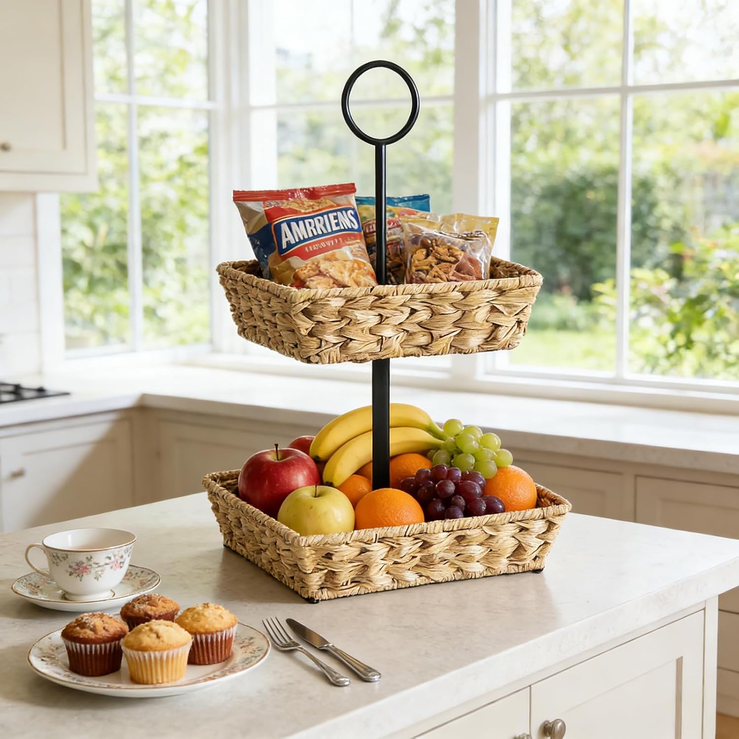 | Additional Features | 2-tier Design, Freestanding, Metal Frame Support, Stackable Baskets, Woven Rattan Construction |