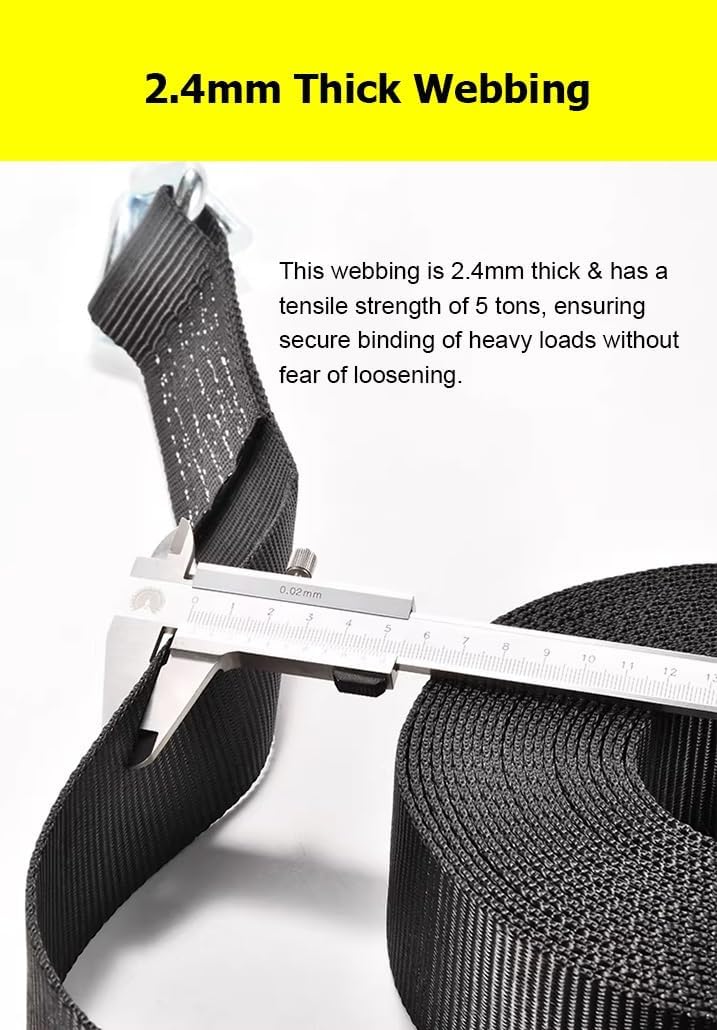 Are you still worried about cargo falling off easily?Heavy duty ratchet straps with no hooks, tie down straps can be widely used to secure cargo for moving and securing equipment, motorcycles, trucks, vans, kayaks, warehouses, etc.Specifications: Name: Polyester Tie Down StrapsMaterial: Polyester Straps + Steel Frame + Aluminum HandleWidth: 5 cm / 2 inLength: 3.0 m / 9.8', 5.0 m / 16.4', 8.0 m / 26.2', 10.0 m / 32.8'Application: Bundling goods /fixing goods, etc.Features:1. High-density cargo straps are wear-resistant and break-resistant2. No Hooks come with these heavy duty straps to prevent scratches, paint drop, etc3. Cargo straps are easy to use, not easy to fall off and can be fixed immediately4. Truck straps have an easy-release mechanism to easily release the tension on the straps5. Ratchet straps have double-stitched edges to prevent slipping during use; ensure that the cargo is firmly fixed in place, giving you peace of mind when transporting cargo; reinforced stitching adds extra strength and stability to the straps6. Tow strap have strong pulling force, 5 tons / 11023 lbs7. Tie down straps are widely used, including moving, securing cargo, camping or other tie-down needs, such as warehouses, motorcycles, canoes, kayaks, ATVs, trucks, boxes, furniture, lawn equipment, etcPackage Included:1 x Heavy Duty Ratchet Strap (No Hooks)Tighten Ratchet Straps Steps:1. Pass the strap under the tensioner rotating shaft2. Pass the strap through the center slot of the tensioner rotating shaft3. Pull the tensioner handle back and forthRelease Ratchet Straps Steps:1. Fasten the safety plate outwards2. Open the tensioner to level3. Pull out the strapNotes:1. Due to manual measurement, there may be a 1-2 cm error, please understand2. Due to different monitors, there may be color differences, please refer to the actual product3. Do not use as a vehicle tow rope, car towing needs to be more load-bearing rope