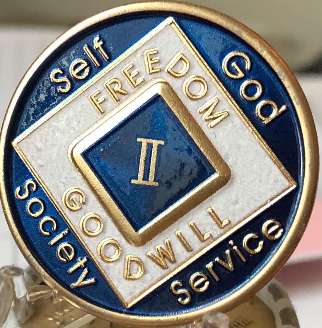 Stunning 2 year Blue and Black Color NA Medallion with II in the center. Size is 1 5/16" or 34x2mm This is an Official Narcotics Anonymous Medallion featuring raised 3D Graphics and Text back of the coin is black color. If it doesn't say NA on the back its not official.