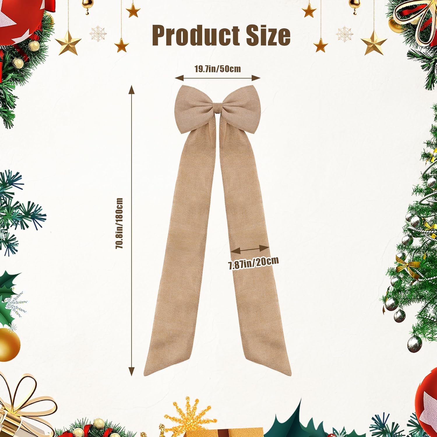 Features:Bring timeless rustic elegance to your holiday décor with this extra large burlap bow Christmas tree topper, designed to make your Christmas tree truly stand out. Measuring 20 × 70 inches with wide ribbon tails, this giant bow adds depth, texture, and a warm farmhouse touch to any festive setup. The double-layer burlap fabric offers structure while keeping a soft drape, blending vintage charm with modern holiday style. Easy to tie and adjust, it’s perfect for decorating trees, wreaths, doors, or walls, creating a cozy and grand seasonal atmosphere for your home, party, or event.Package Included:1 × Extra Large Burlap Christmas Tree Topper Bow (20 × 70 inches)Specification:Material: Double-Layer Burlap FabricColor: Natural Burlap BrownBow Width: 19.7 inches (50 cm)Tail Length: 70.8 inches (180 cm)Ribbon Width: 7.87 inches (20 cm)Installation: Tie-on back straps for easy and stable attachmentTheme: Rustic Farmhouse Christmas DécorUsages:Christmas Tree Topper Decoration, Holiday Wreath Accent, Front Door or Wall Hanging Bow, Gift Box Topper for Large Presents, Rustic Party or Wedding Backdrop DecorationWarm Tips:Gently shape the bow after unpacking to restore fullness; Slight size variations may occur due to manual measurement.This burlap Christmas tree topper bow brings a warm, rustic touch to your holiday décor, combining farmhouse charm with festive elegance. Its oversized design and double-layer construction make it a stunning centerpiece for trees, doors, or wreaths—adding cozy, timeless beauty to every holiday celebration